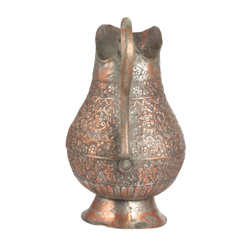 A vintage style copper jug or pitcher decorated with lovely floral motifs in Islamic art. This traditional copper jug is handmade by skilled and experienced Indian craftsmen from Hyderabad using ancient methods. It has a handle for a better grip. In the past, this copper pitcher was used in Indian households for drinking and washing hands after meals. It was also used in rituals and auspicious events. Nowadays, this trendy jug is used for stage decoration, home, office, restaurants and hotels. Add a seductive flair to the interior of your home by placing this exquisite piece on the dining table or shelf. Gift this incredible pitcher to your loved ones on special and festive occasions.