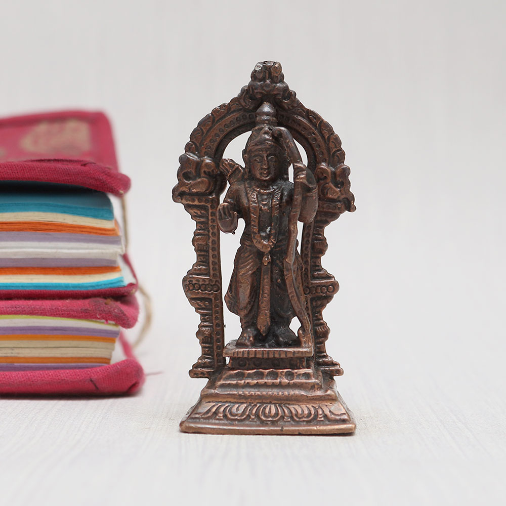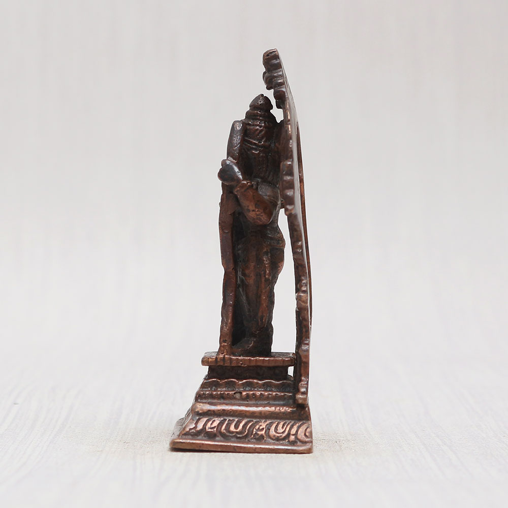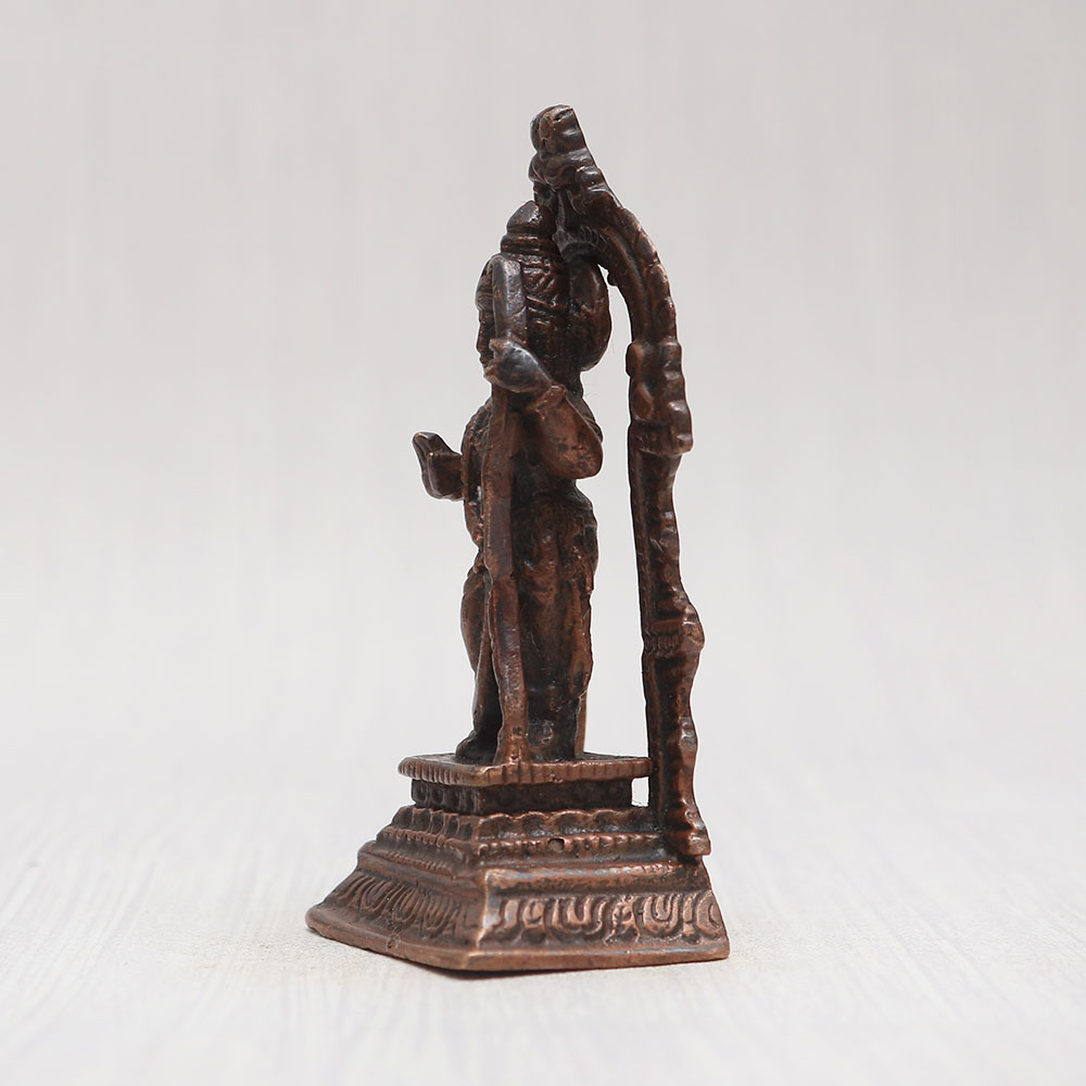 Buy a Copper Statue of Lord Ram online that is crafted by local Indian artisans with unparalleled artistry and devotion. Standing gracefully on a sturdy platform adorned with a captivating prabhavali frame, this masterpiece is meticulously handcrafted from high-quality copper, giving it a timeless vintage finish. This mesmerizing Lord Ram statue is a perfect addition to your prayer room at home, office, restaurant, cafe, or shop, radiating positive vibes and spiritual energy. Its intricate detailing is truly eye-catching, making it an ideal centerpiece for decoration, and collection. Designed with reverence, this statue is not only a symbol of devotion but also an essential piece for worship in temples. Its versatile charm makes it a thoughtful and cherished gift for your loved ones on special, festive, or auspicious occasions. Experience the divine aura of this enchanting creation and easily buy idols online - a divine possession for your personal sanctuary.