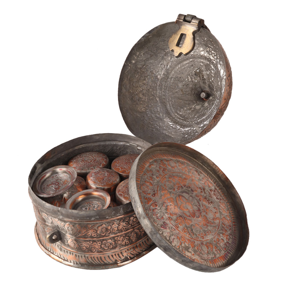 The vintage copper paan daan has 5 storage boxes. It was used to store paan or its ingredients. Engraved with beautiful floral patterns. Paan is made from betel leaves and ingredients like cardamom, cloves, zarda, supari and others. Use it to decorate your home or office.