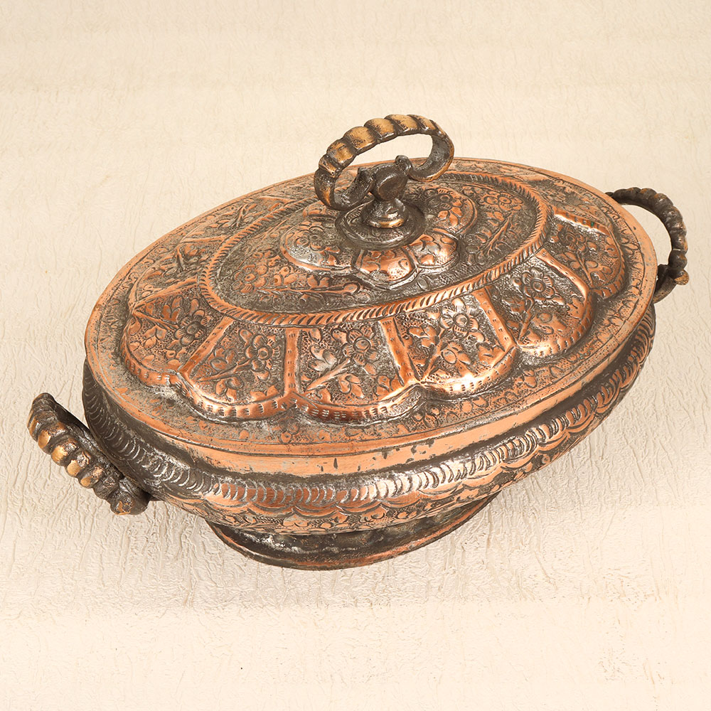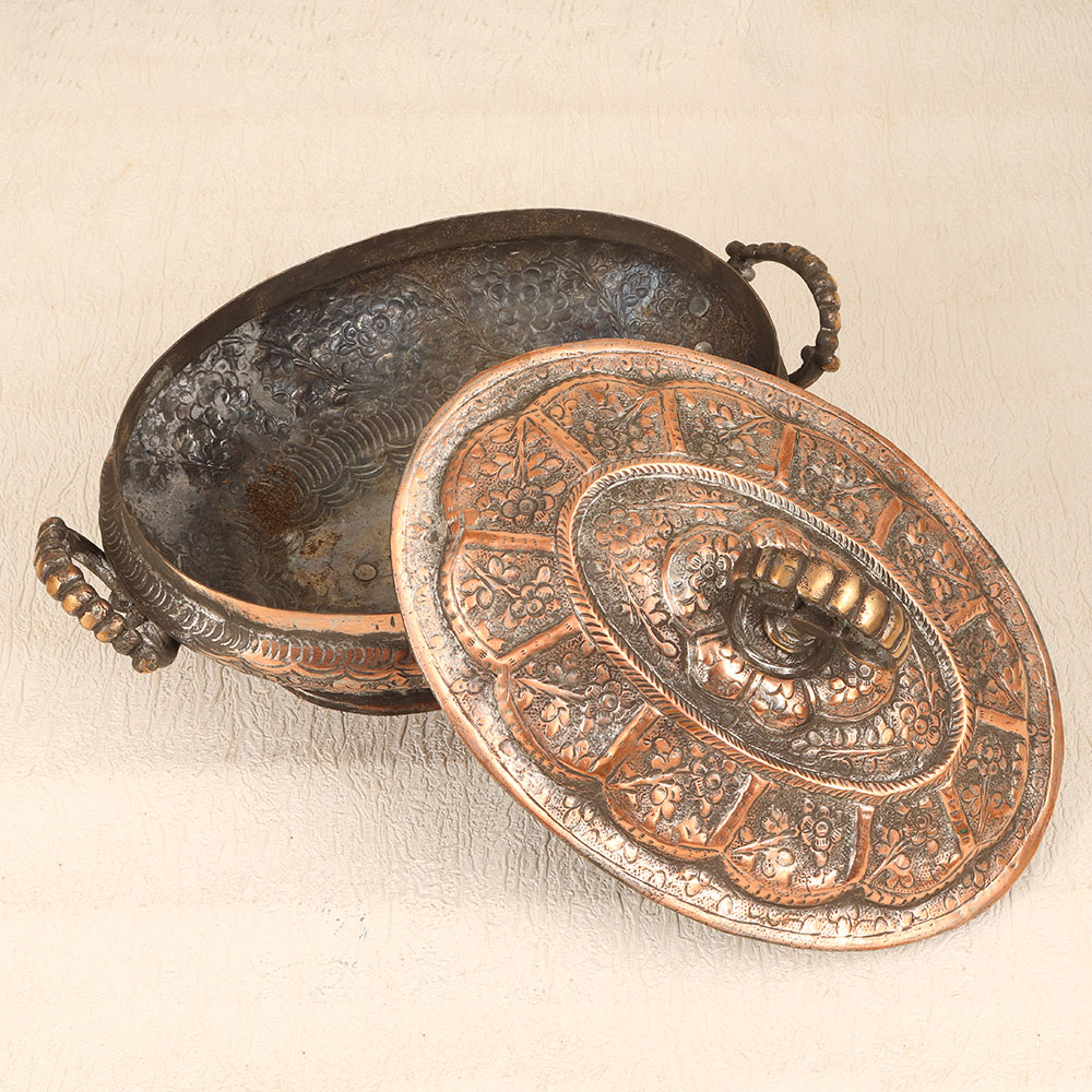 Step back in time with this vintage copper rice bowl featuring a mesmerizing Islamic-inspired engraved design. Crafted by hand in Hyderabad, this stunning bowl evokes the exotic bazaars of a faraway land. Serving up rice, soup or salad in this bowl is sure to spark conversation. The eye-catching pattern and copper finish give it an heirloom look and feel. And the excellent heat retention keeps foods hot and delicious. Display this bowl as artwork when not in use. The engraved design brings intrigue and elegance to any space. Or pass it down to future generations - this bowl will only grow more beautiful with time and use. For rice lovers, collectors of exotic decor, or anyone looking to add a touch of spice to their table, this copper bowl delivers. The craftsmanship, patina, and hypnotic engraving make it a statement piece. Take your meals from boring to bazaar by serving them in this work of art from Hyderabad.