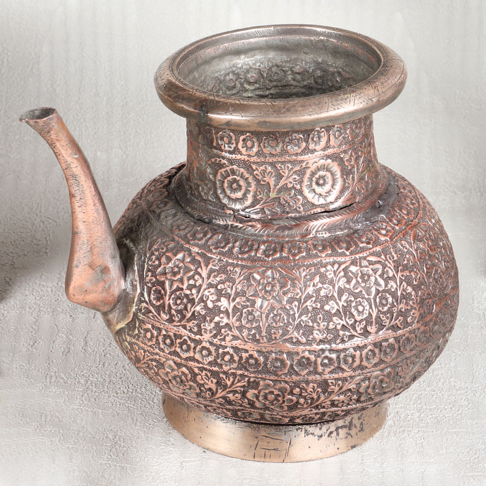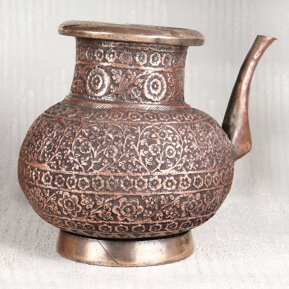 Buy a Vintage Copper Water Pot with Spout online that is a testament to the timeless craftsmanship of highly talented Indian artisans. Handcrafted in the heart of Hyderabad, this piece is a work of art, steeped in the rich heritage of Islamic design. Crafted from the highest quality copper, it bears an antique brown finish that lends it a rustic charm. The surface is adorned with intricate engravings, showcasing the artistry that has been passed down through generations. Its versatile design allows it to grace various settings, be it in your home, office, restaurant, hotel, or cafe, enhancing the ambiance with its historic allure. This pot serves more than just an ornamental purpose, it can also be used during religious rituals and prayers, making it a cherished item in temples and prayer rooms. For vintage collectors, it's a rare gem, and for exhibition enthusiasts, it's a captivating centerpiece. Furthermore, it makes a thoughtful and meaningful gift for your family, friends or relatives on special, festive, or auspicious occasions. Invest in a piece of history, and let the Vintage Copper Water Pot be a timeless addition to your surroundings.