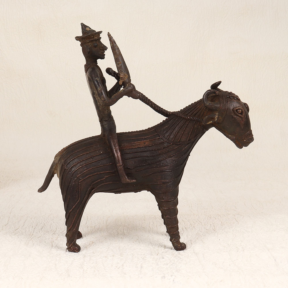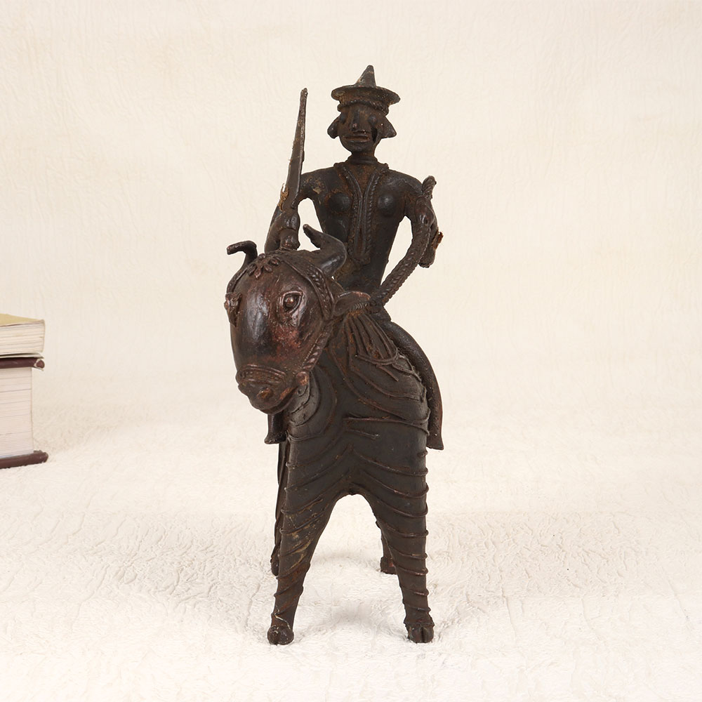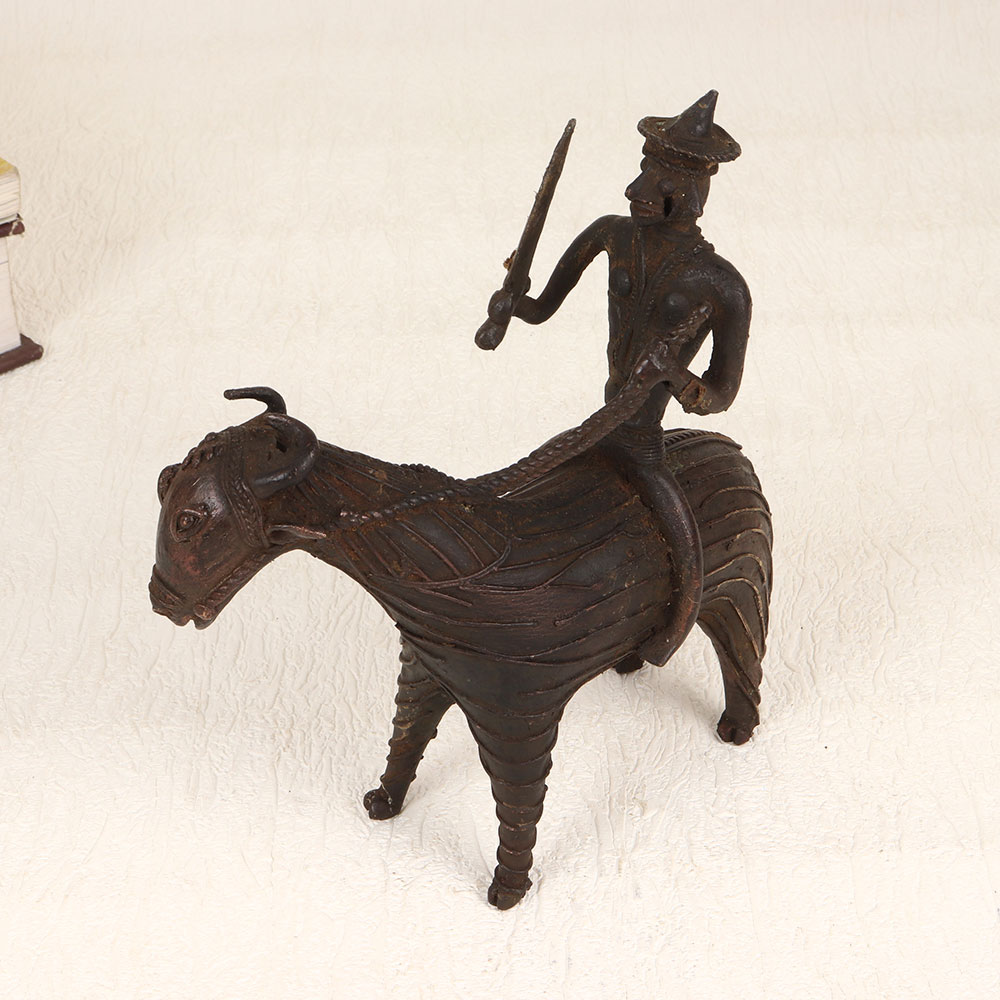 This Vintage Brass Sheep with Rider in Tribal Art exudes timeless charm and cultural richness. Meticulously handcrafted by skilled artisans from Bengal, India, this masterpiece showcases the fusion of traditional craftsmanship and tribal aesthetics. The brass sculpture features a dark finish that accentuates its vintage allure. Crafted from high-quality brass, this unique piece is not just a decor item but a testament to the artisan's expertise. Ideal for adorning various spaces, including homes, offices, restaurants, hotels, or cafes, this versatile artwork seamlessly blends into any setting. Beyond its decorative appeal, the sculpture makes for an exquisite addition to vintage collections, reflecting a deep appreciation for cultural heritage. Whether as a thoughtful gesture or to mark special occasions, this brass sheep with rider serves as an impeccable gift. Celebrate moments of joy, festivals, or auspicious occasions by presenting your family, friends or relatives with this symbol of craftsmanship and tradition, a tangible expression of artistry and cultural finesse.