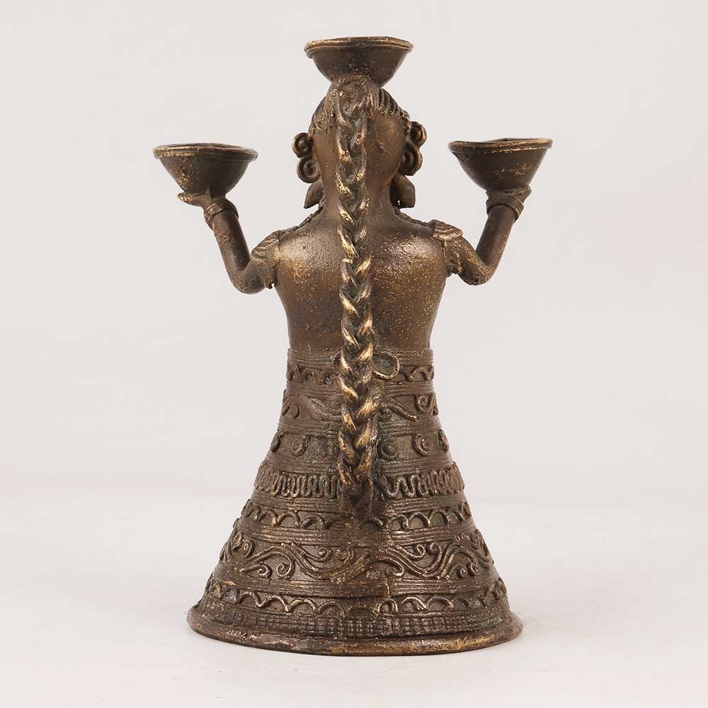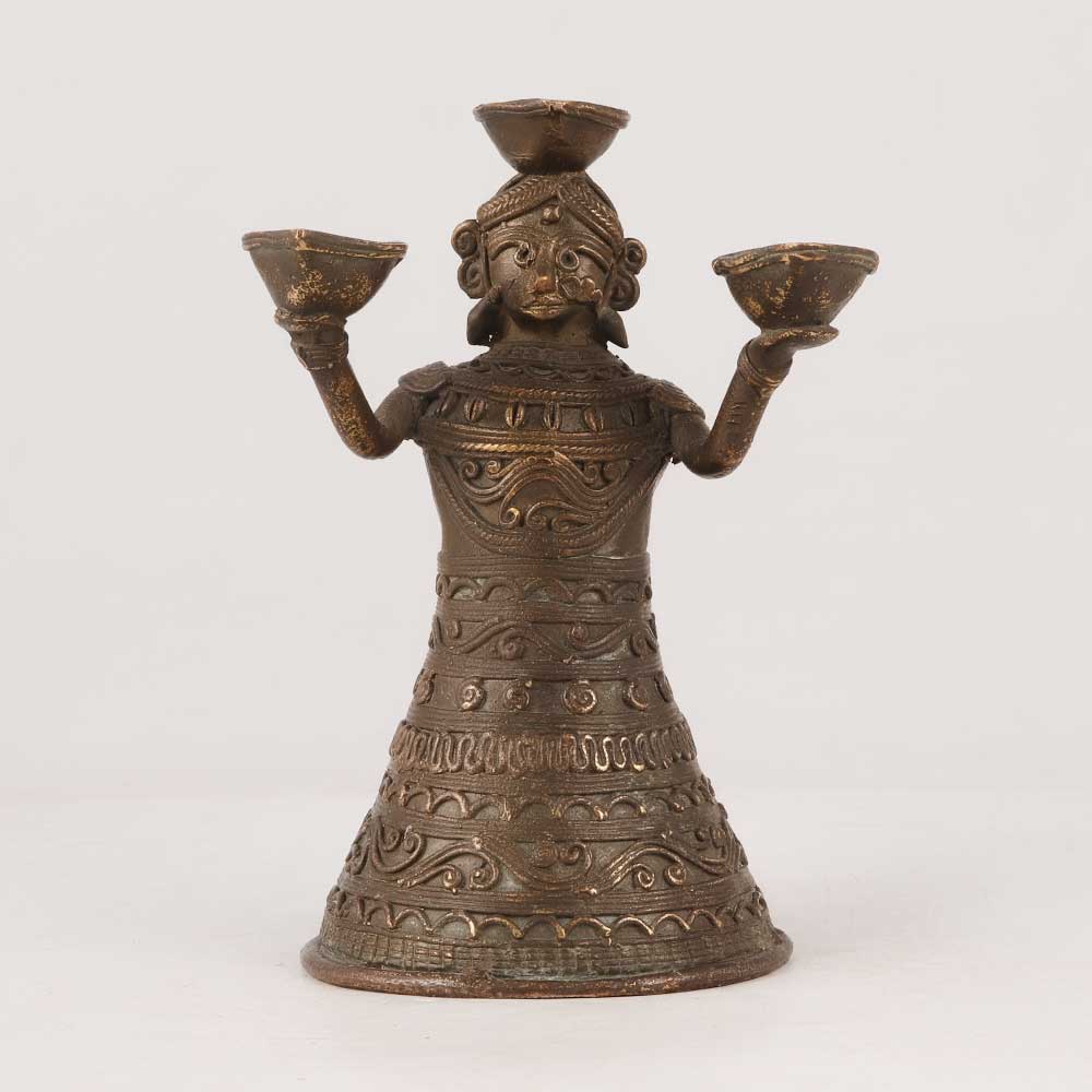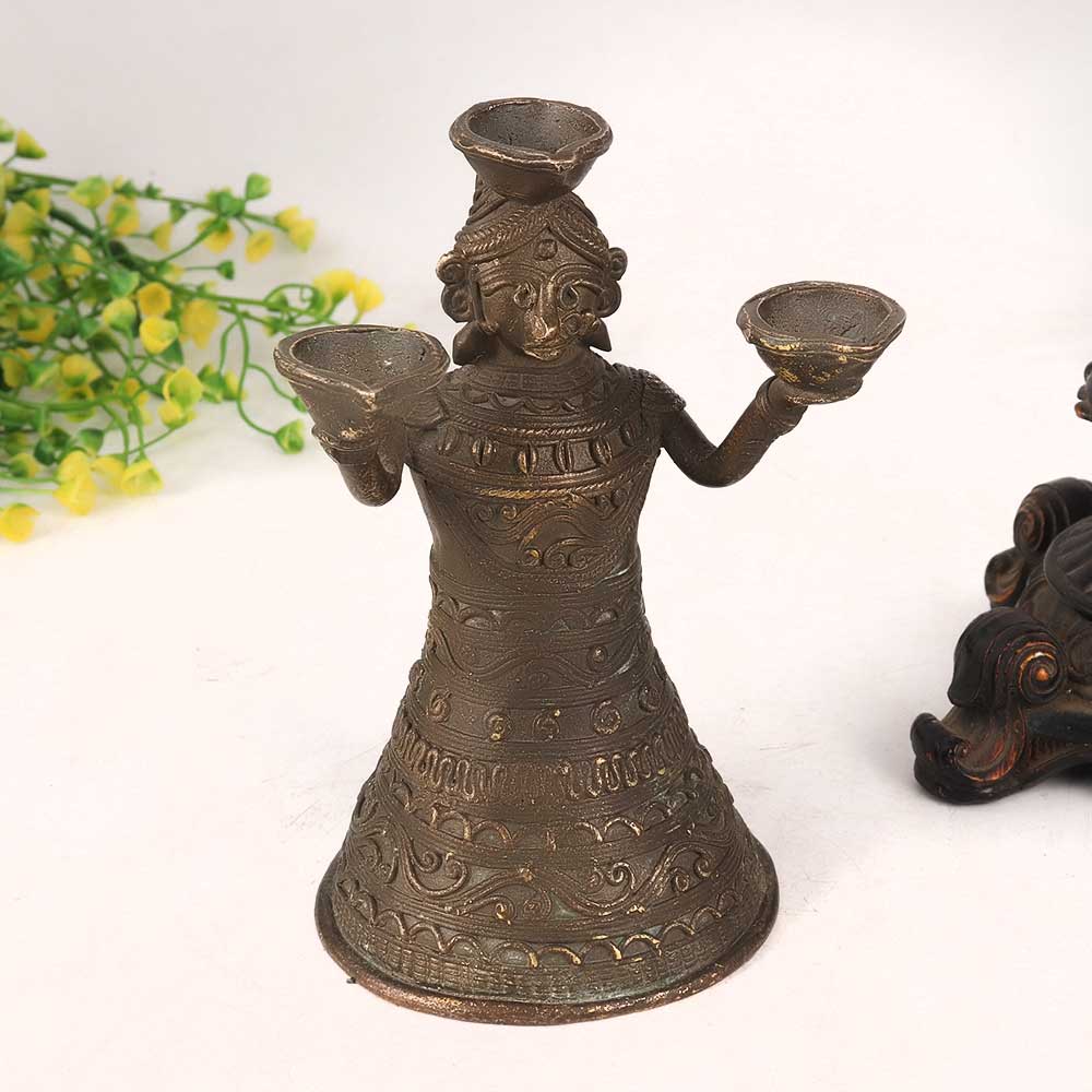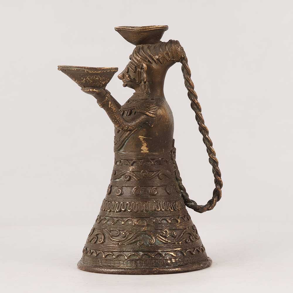 Embrace the charm of tradition and tribal art with this Vintage Brass Doll Oil Lamp in Antique Brown Finish. Handcrafted with precision by highly talented Indian artisans, this lamp exudes an aura of nostalgia and craftsmanship. Its unique design features intricate tribal patterns and an antique brown finish, adding a touch of vintage elegance to any space. Ideal for both spiritual and decorative purposes, this lamp can be gracefully placed in homes, offices, restaurants, hotels, or cafes, particularly in prayer rooms for worship ceremonies. Using mustard oil or ghee with cotton wicks, the lamp provides a warm, soothing glow, creating a serene ambiance during prayer rituals. Equipped with three lamps, it allows you to light up multiple areas simultaneously, enhancing its utility. Beyond its religious significance, it serves as a captivating addition to your antique collection or adds an artistic flair to exhibitions and events. Celebrate the joy of giving by presenting this lamp to your loved ones on special or festive occasions, expressing your affection and sharing the rich heritage of Indian craftsmanship. Embodying tradition and artistry, this Vintage Brass Doll Oil Lamp is a timeless treasure that embodies the spirit of the past while illuminating the present.