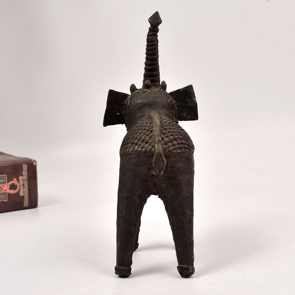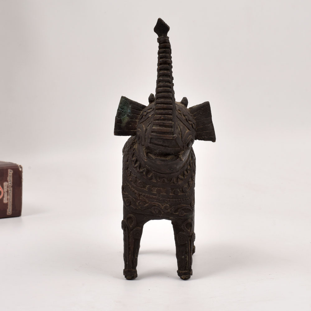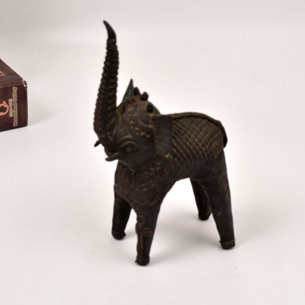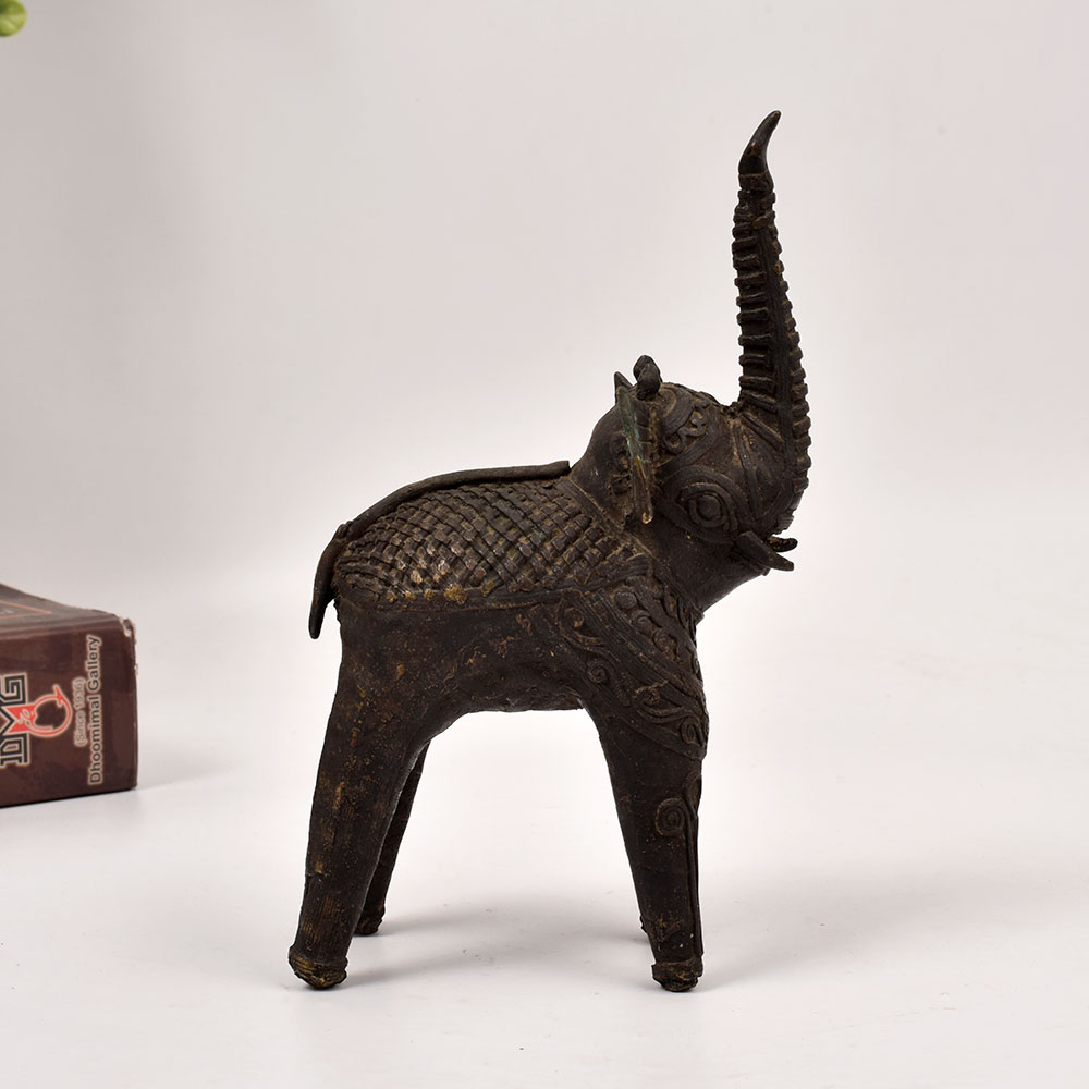 Infuse your home or office with the majestic beauty of the wild with this stunning vintage brass elephant statue. Crafted in the revered Bastar Art style, this piece is a true testament to the incredible skill and artistry of Indian craftsmen. Meticulously sculpted from solid brass, the statue features an antique finish that gives it an air of timeless elegance. The elephant's raised trunk is a revered symbol in many cultures, representing power, strength, and good fortune - making this statue a wonderful addition to meditation spaces, living rooms, or professional settings. At an impressive size, this brass elephant statue commands attention as a captivating focal point. Its regal presence instantly elevates the ambiance of any room, infusing it with a sense of exotic, nature-inspired beauty. Whether displayed on a mantle, side table, or office shelf, this statue is sure to become a treasured conversation piece that showcases your impeccable taste. Bring the grandeur of the jungle into your home or workspace with this exquisite Bastar Art masterpiece. Its exceptional craftsmanship and symbolic significance make it a truly special piece that will be admired for years to come.