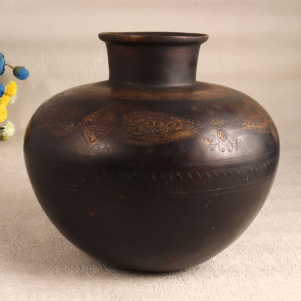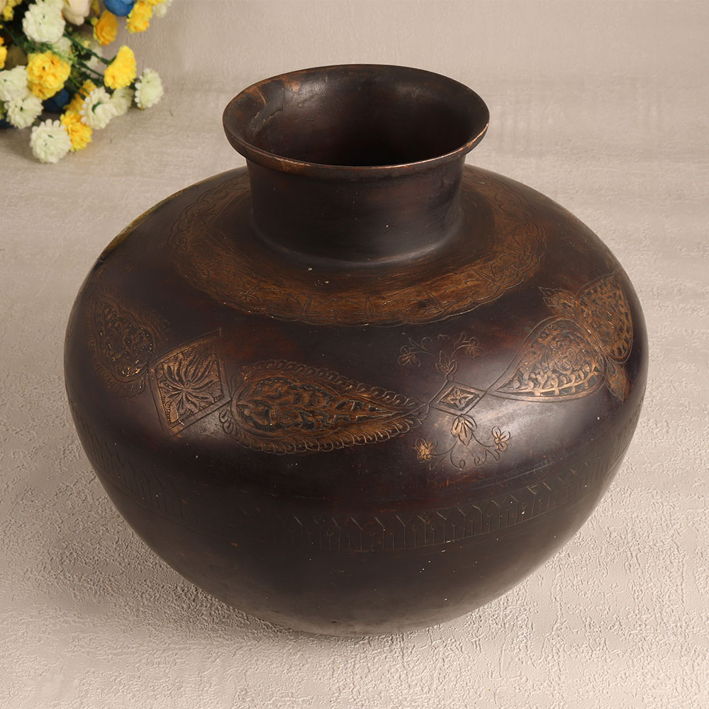 Buy a Vintage Brass Flower Pot online from our website and get a hassle free delivery at your doorstep. This exquisite piece is a testament to the craftsmanship of highly skilled Indian artisans hailing from the historic city of Hyderabad. Handmade with the utmost precision and care, this flower pot showcases their mastery in working with high-quality brass. The intricate carvings adorning the surface of the pot are a testament to the artisan's dedication to detail. The antique dark finish adds a touch of old-world charm, making it a perfect fit for a wide range of settings. Whether you're looking to enhance the ambiance of your home, office, hotel, cafe, shop, or restaurant, this flower pot will be an enchanting addition. Moreover, it's an ideal choice for collectors, as it can be proudly displayed at exhibitions and showcases. This brass flower pot also makes for a thoughtful and meaningful gift for your family, friends or relatives on special, festive, or auspicious occasions, allowing you to share the beauty and craftsmanship of Indian heritage. Embrace the rich history and artistry of Hyderabad with this remarkable vintage brass flower pot.