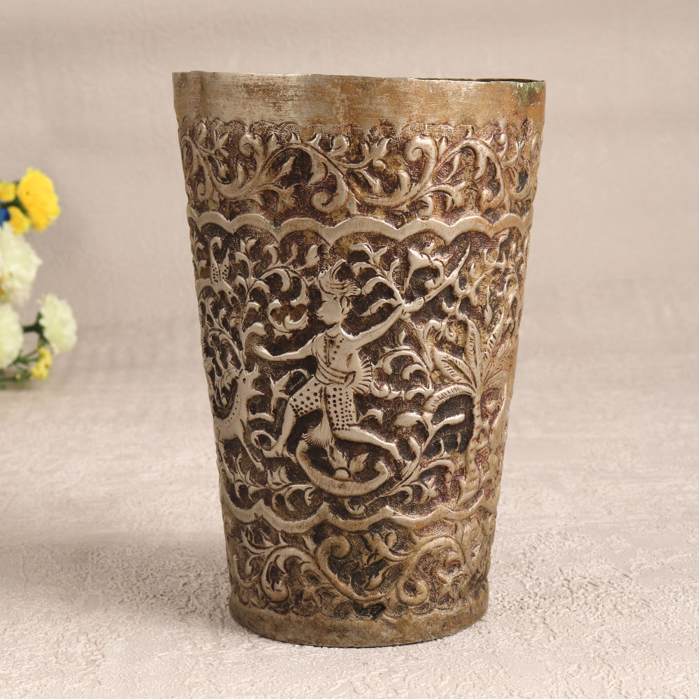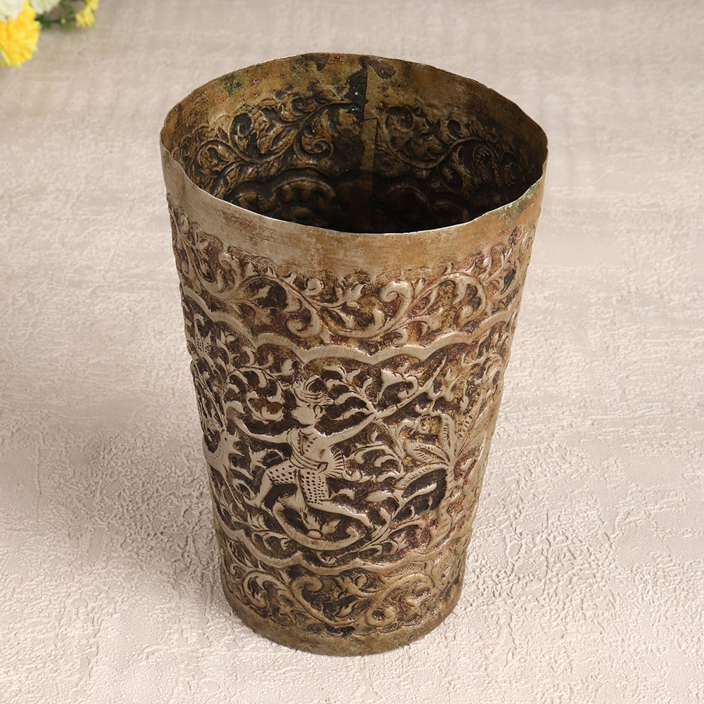 Enhance your interior decor with a timeless piece of Indian craftsmanship which is a vintage white Brass glass with exquisite carving and a captivating antique gray finish. This stunning creation is the result of highly skilled artisans from Himachal, who have meticulously crafted it using high-quality white Brass. This piece is not just a glass, it's a work of art that adds an air of sophistication to any space. The intricate carving on this glass reflects the rich heritage of Indian craftsmanship and tradition. Its antique gray finish gives it a sense of history and character, making it perfect for a variety of settings. Whether you want to enhance your home, office, hotel, cafe, shop, or restaurant's decor, or create a peaceful ambiance in your prayer room, this vintage white Brass glass is versatile and adaptable. Moreover, it serves as an ideal addition to your vintage collection or a remarkable piece to showcase at exhibitions. Its timeless beauty also makes it an exceptional gift for your family, friends or relatives on special, festive, or auspicious occasions. Embrace the beauty of Indian artistry and heritage with this vintage masterpiece.