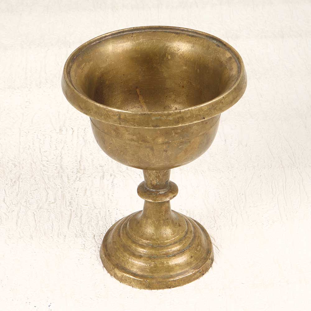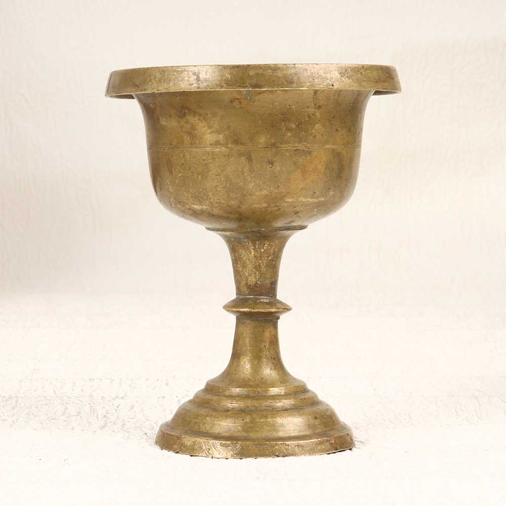 Step back in time with this antique-styled vintage brass holy cup. Featuring a gorgeously aged patina, this cup evokes spirituality and tradition for your home rituals. Display this cup prominently on your home altar or in your pooja space to elevate your rituals. The vintage styling allows you to feel connected to the past and honour tradition. Hold offerings like water, milk, flowers or anything else with meaning in this beautiful brass cup. For those wanting an old-world, traditional touch for their home worship spaces, this vintage brass holy cup delivers. The antique patina and craftsmanship give it the look and feel of an ancient artefact. Add ritualistic charm and elegance to this cup.