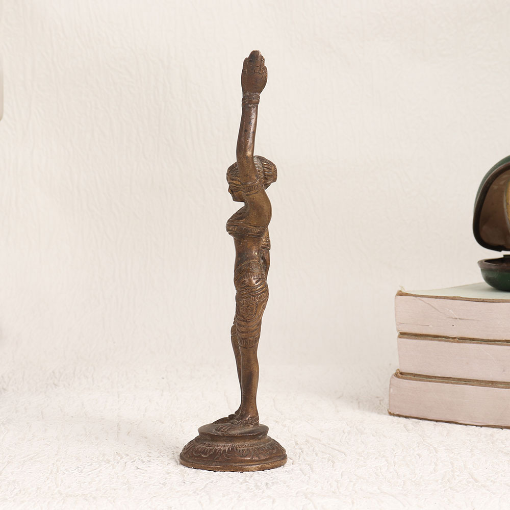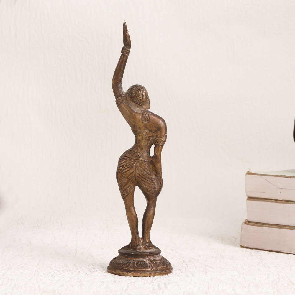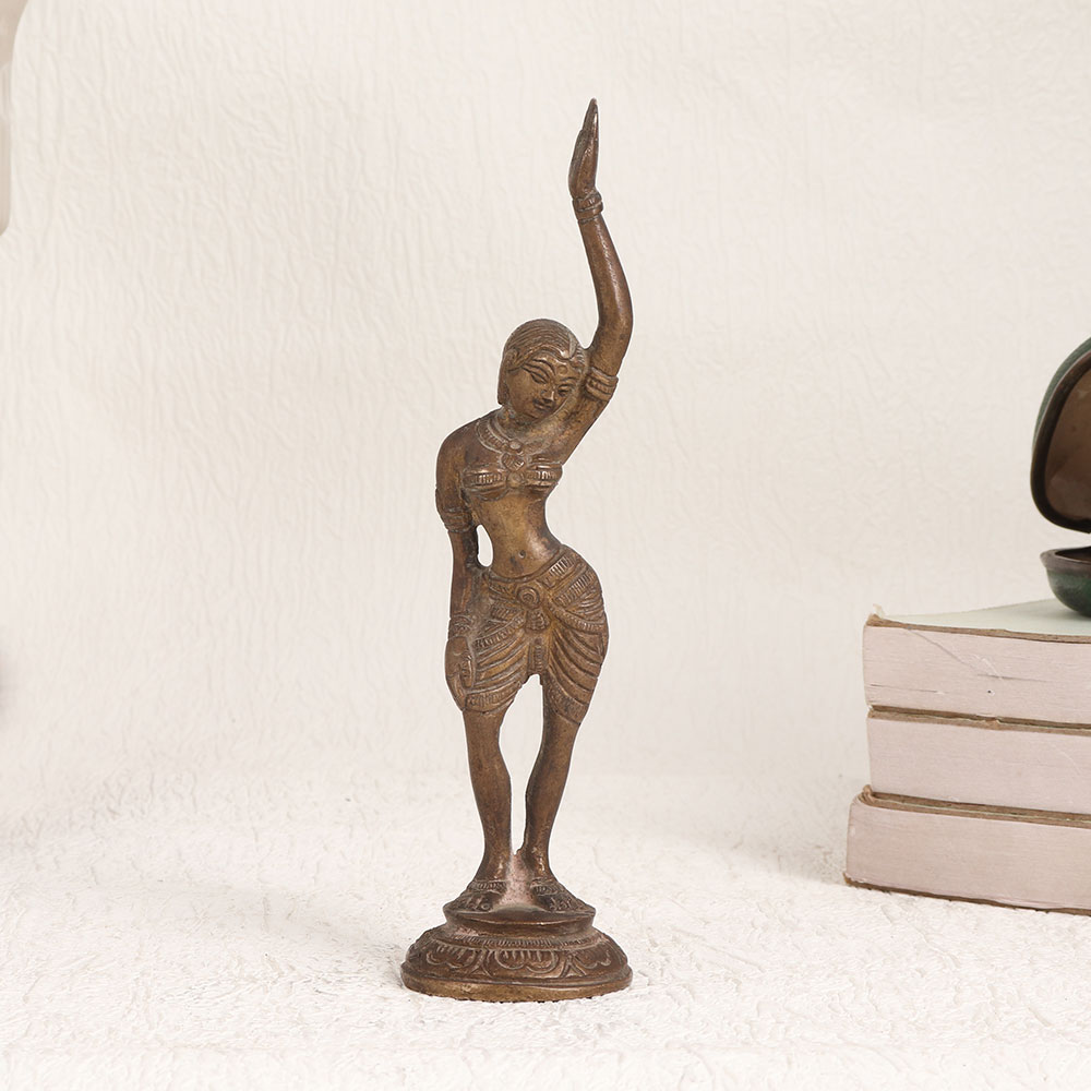 Adorn your decor with the exquisite beauty of our Brass Lady Statue in a captivating dancing pose. This stunning piece is showcased on a platform with an antique brown finish that exudes timeless elegance and craftsmanship. Handmade by professional Indian artisans with a meticulous eye for detail, this statue is a testament to their dedication to preserving traditional artistry. Crafted from high-quality brass, this statue is not only a visual delight but also a symbol of enduring quality. Its versatility allows it to seamlessly enhance various settings, including your home, office, restaurant, hotel, cafe, or shop. Whether you're seeking to augment your vintage collection or create an enchanting exhibition display, this piece is the perfect addition. Furthermore, this Brass Lady Statue makes for a thoughtful and meaningful gift. Present it to your family, friends or relatives on special occasions, festive celebrations, or auspicious moments, and watch as it becomes a cherished keepsake in their homes. Embrace the beauty of Indian artistry and bring this graceful dancing lady into your life today.
