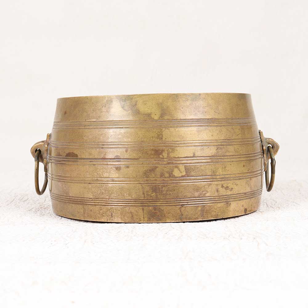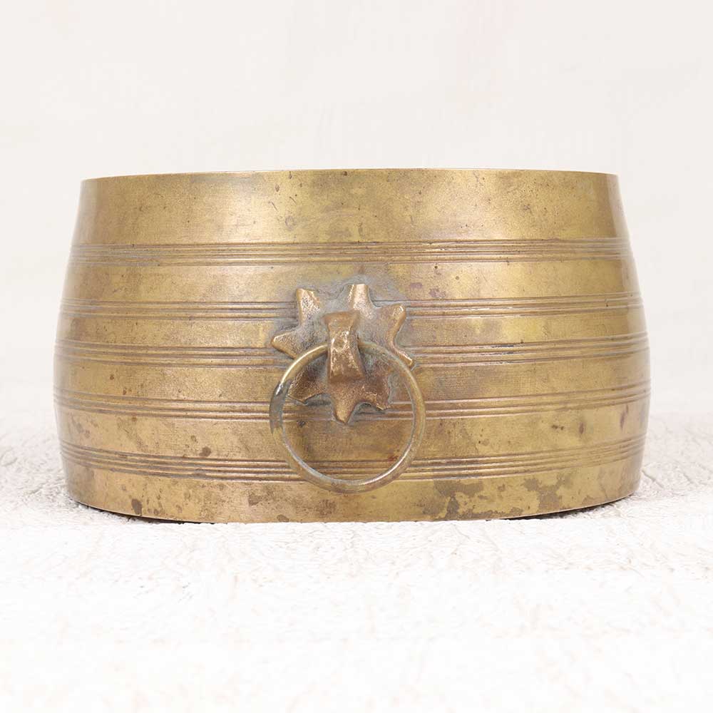 Step back in time with this vintage brass planter showcasing the exotic artistry of historic South India. Crafted entirely from solid brass, this planter features an intricately patterned design reminiscent of ancient Indian artwork. Display your favorite plants in this striking brass planter that evokes the exotic styles of ancient South Indian art. The vintage brown finish gives it a timeworn look that feels like a family heirloom passed down through generations. Place it in your living room, bedroom, or office to infuse your space with old-world charm. For an elegant home decor piece with historic roots, this brass planter delivers exotic South Indian-inspired style.