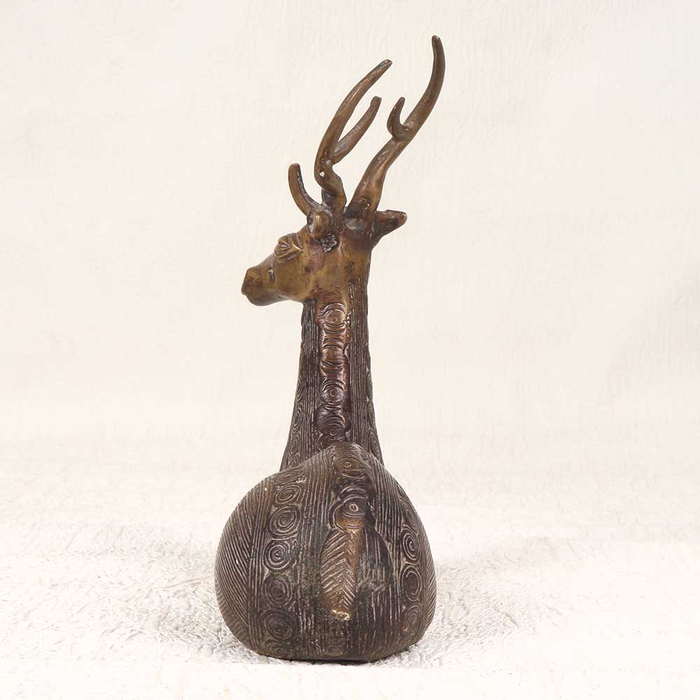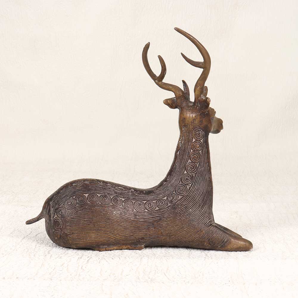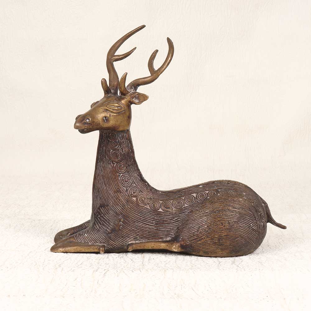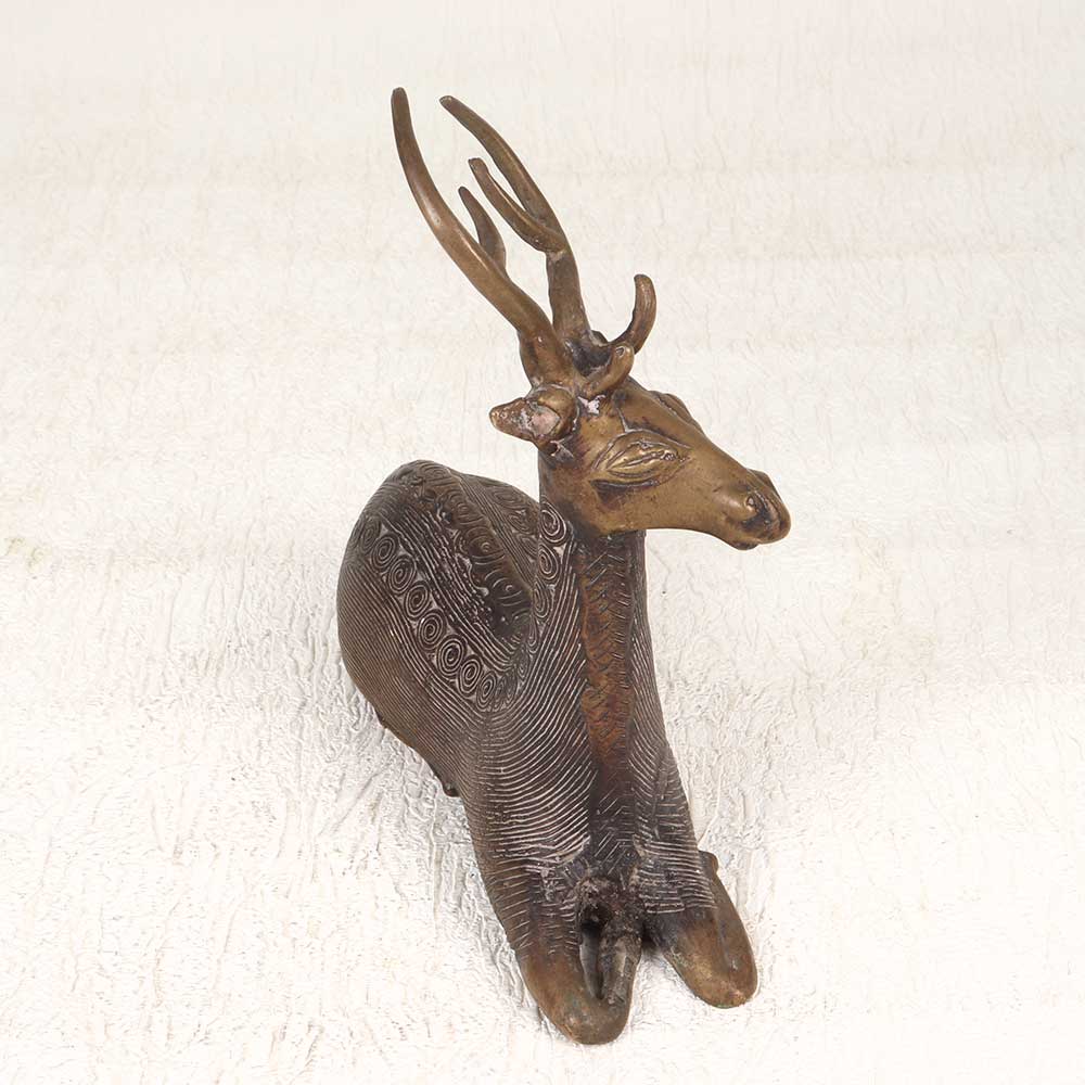 Make a statement with this stunning vintage brass deer sculpture, handcrafted using traditional techniques from Odisha. This exquisite deer sculpture embodies the serenity and nobility of nature's creations. The deer sits with perfect poise, its slender legs folded gracefully underneath while its head is held high in a regal yet calm stance. Every detail of its textured fur and alert pose has been painstakingly captured by the talented tribal artisan. This is Odishan artistry at its finest. The vintage patina on the brass sculpture highlights its rich history and craftsmanship. Place this deer statue on display as a standout focal point. It lends elegance and tranquility to shelves, tabletops, mantels, and more in any style home. For art collectors, nature lovers, or anyone seeking a unique decorative accent, this vintage brass deer sculpture is sure to impress.