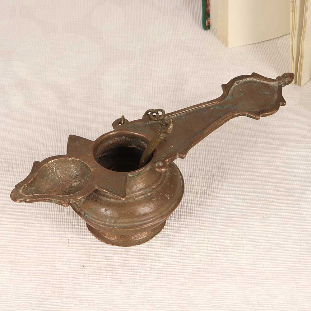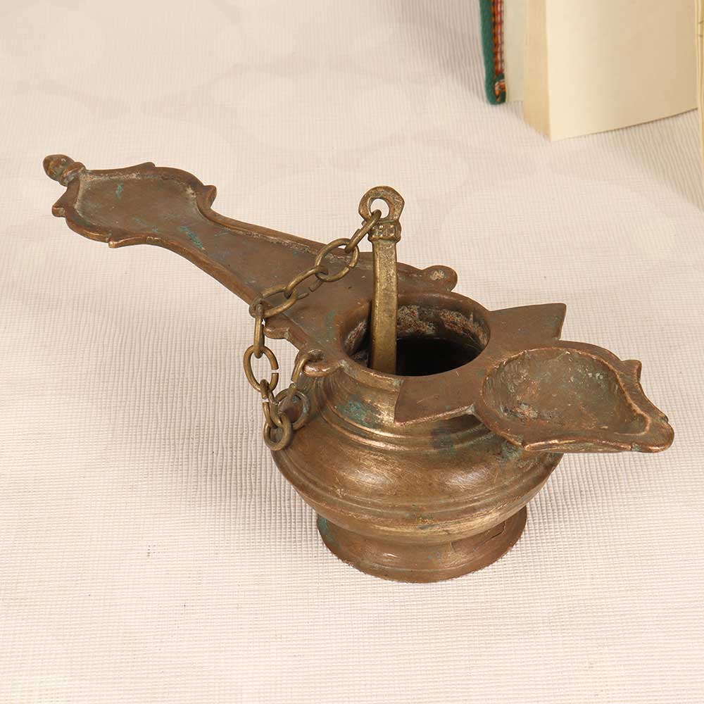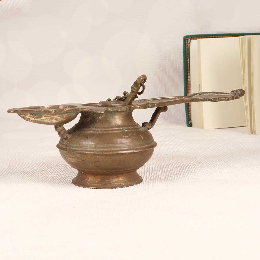Step into the glow of nostalgia with this handcrafted brass ghee lamp. Lovingly made in the South Indian style, it brings the elegance of tradition to your home. Kindle fond memories every time you light this lamp. Its warm glow sets a soothing ambience for gatherings with loved ones, bringing back reminiscences of togetherness. Place it on your dining table to complement your decor and uplift mealtimes. Or let it take centerstage on the mantel or shelf. This handmade lamp allows you to carry on the tradition of lighting ghee lamps - a symbolic gesture in South Indian culture during auspicious occasions. An antique charm that infuses your home with nostalgic warmth and the comfort of family bonds.