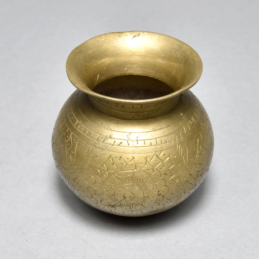 Unlock the timeless traditions of Himachal with this stunning brass holy water pot, meticulously crafted to elevate your spiritual rituals. Featuring intricate engraved floral designs, this vintage masterpiece exudes an aura of reverence and sophistication. Infuse your daily life with the transformative power of ritual. This brass holy water pot invites you to mindfully connect with the divine, whether you're performing puja, cleansing your aura, or simply seeking a moment of peaceful reflection. Its stunning appearance will captivate guests and inspire deeper spiritual engagement in your home. Designed to be a treasured heirloom, this Himachal-sourced pot is a testament to the region's rich cultural heritage. Passed down through generations, it represents a link to ancient wisdom and the beauty of traditional craftsmanship. Elevate your sacred practice and infuse your space with timeless elegance by welcoming this exquisite piece into your life.