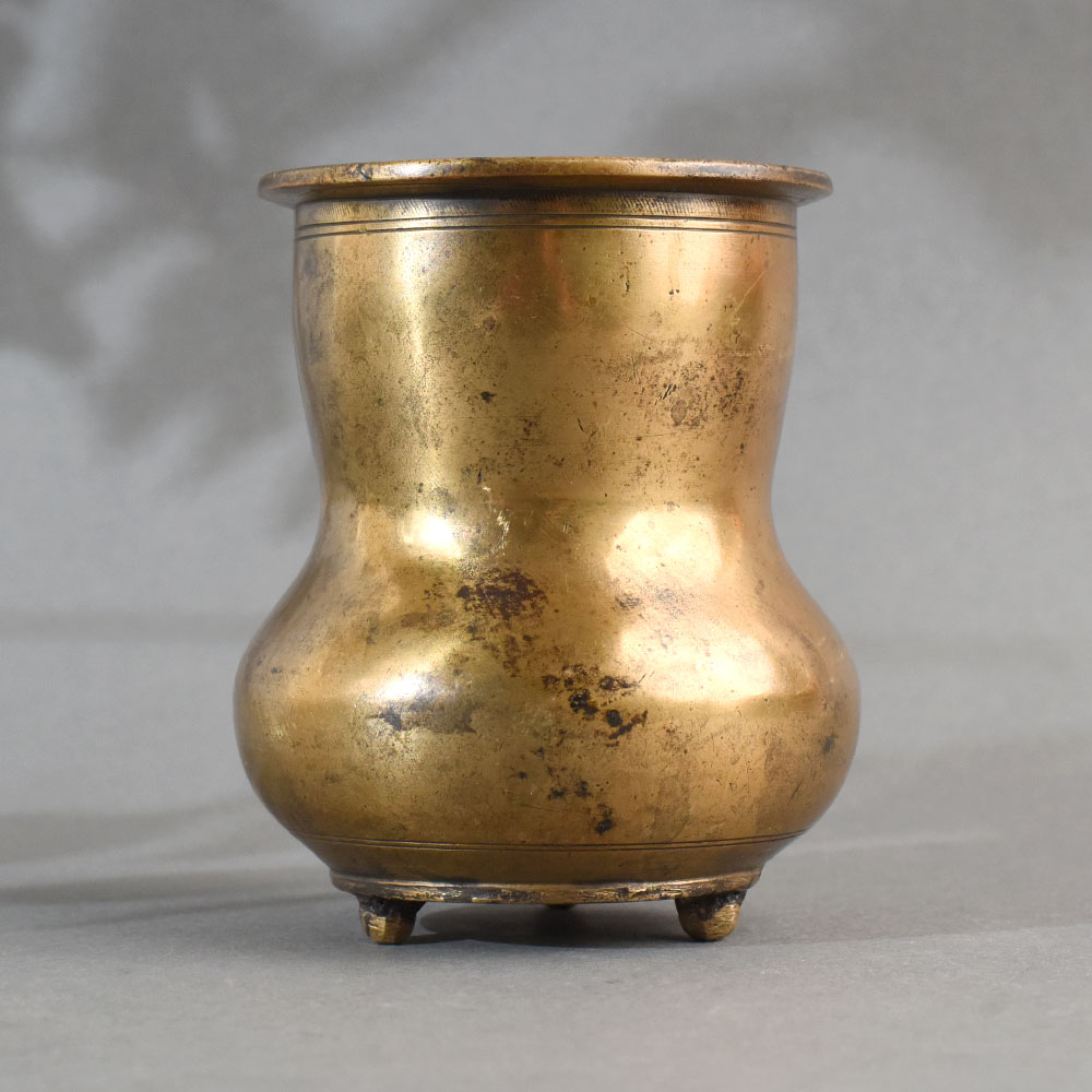 This antique brass Panchpatra water pot is a sacred vessel traditionally used in Hindu religious practices. Crafted from solid brass, it features a beautifully curved, pot-bellied form with a gently flared rim and stands gracefully on four small ornate feet. The smooth surface and aged patina reflect years of devotional use, making it a meaningful addition to any spiritual or antique collection. The Panchpatra is an essential item in daily puja, abhishekam, and ceremonial rituals. Used to store and dispense Gangajal (holy water), it is often paired with an uddharani (spoon) to sanctify offerings, cleanse idols, or perform spiritual purification. The raised footed base ensures the pot remains elevated—symbolizing respect and purity by preventing direct contact with the ground. Brass, revered in Indian culture, is known for its purifying energy and spiritual symbolism.
