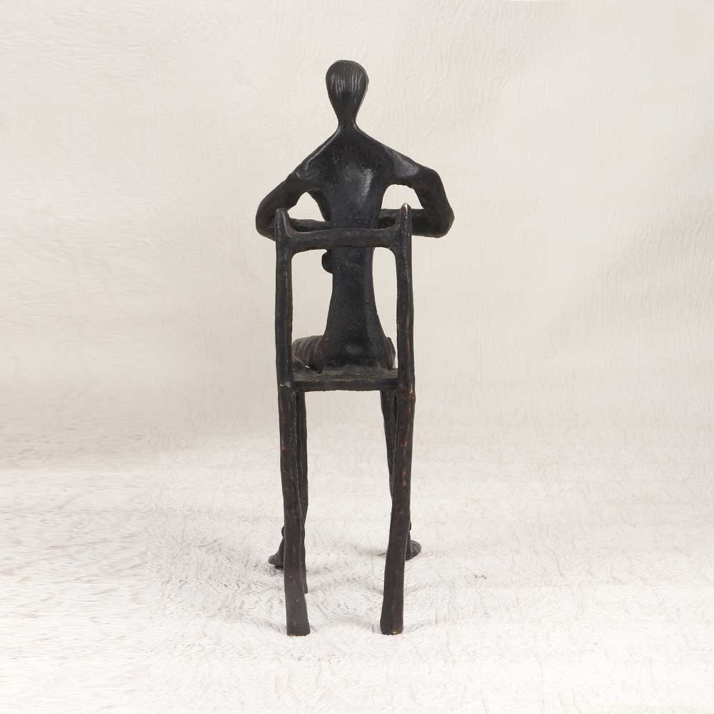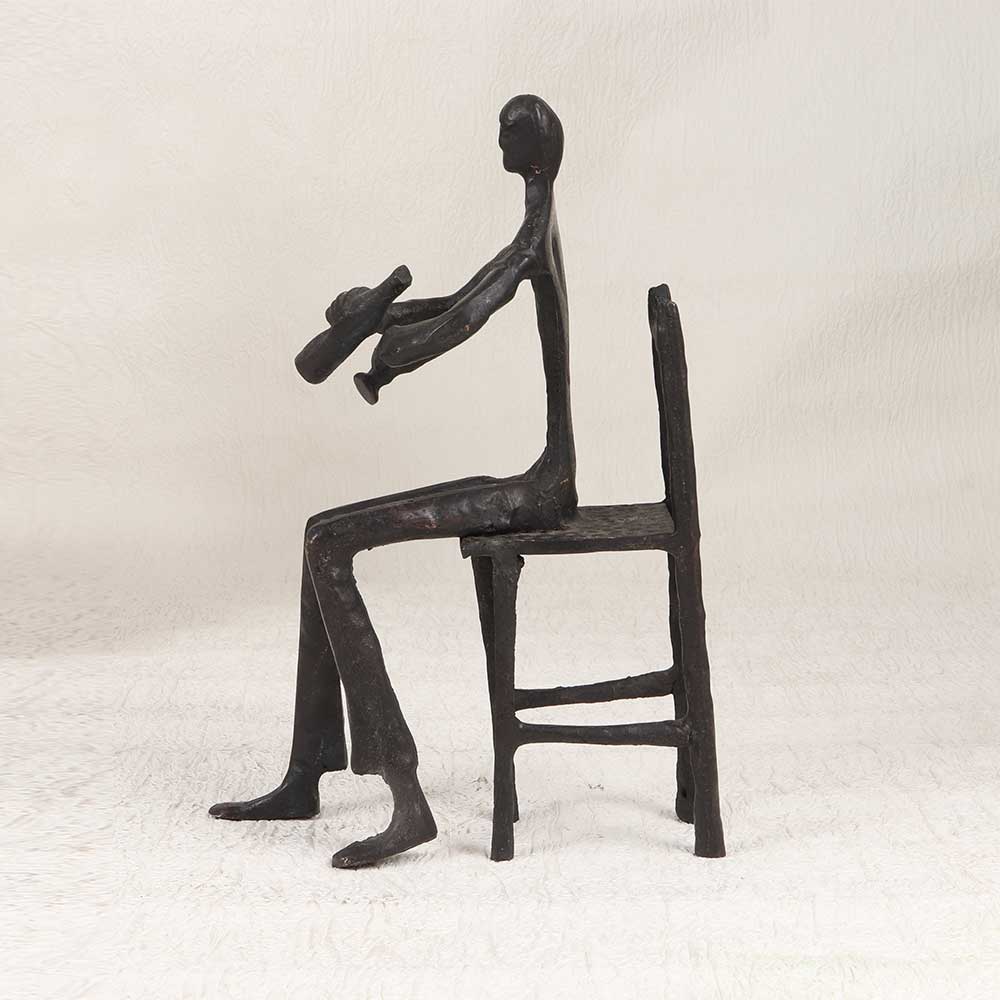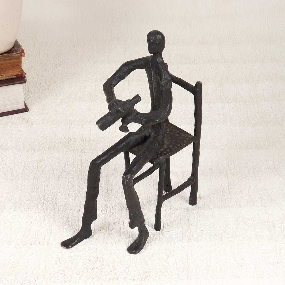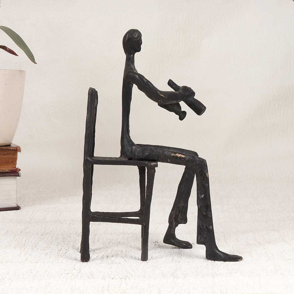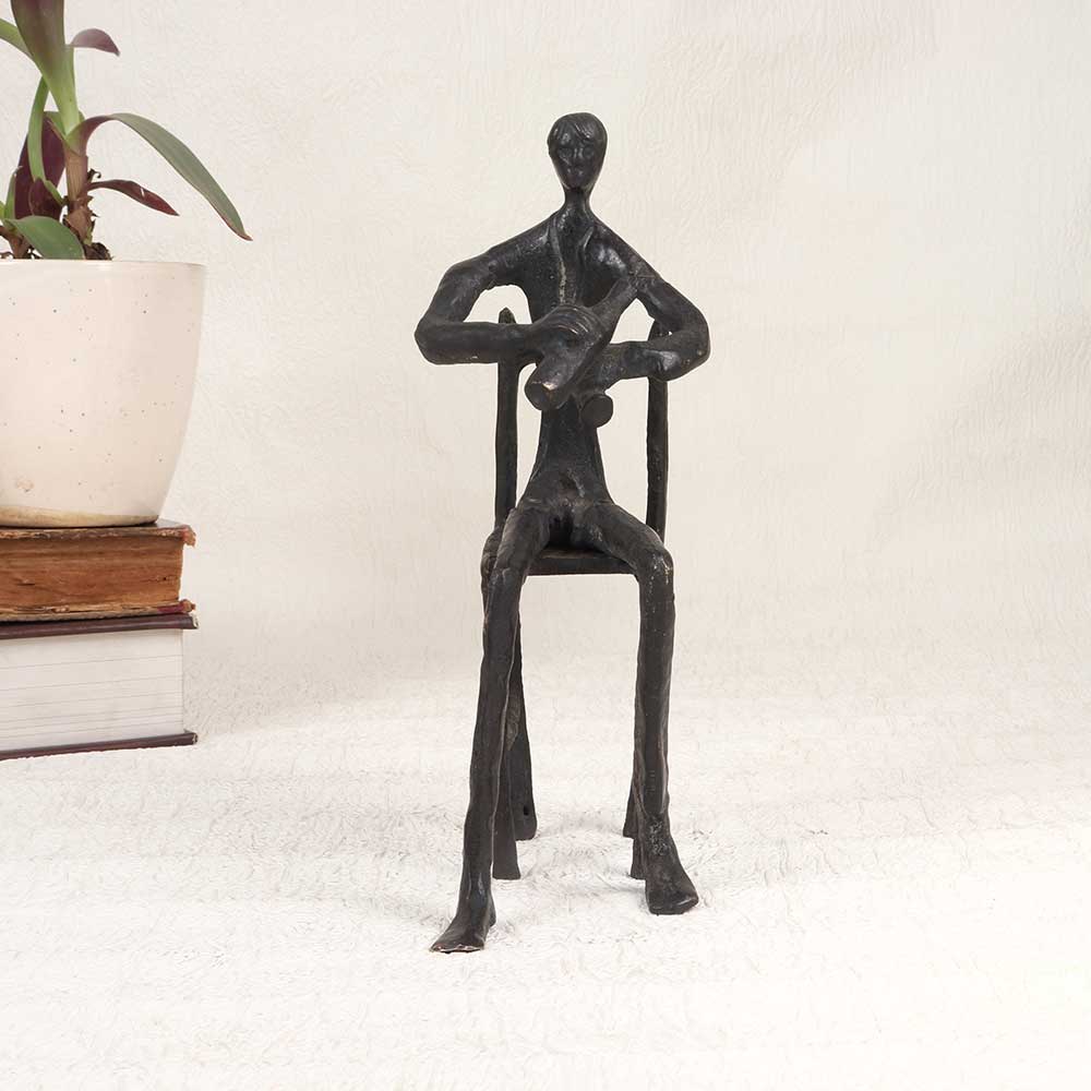 Make a bold statement with this vintage brass musician statue that brings artful charm to any space. Depicting a robed musician sitting on a wooden chair playing music with glass bottles, this finely crafted statue has exquisite detailing that captures a whimsical musical scene. From the focused expression on the musician's face to the intricate folds of the flowing robes, this vintage brass statue is an impressive work of art. The timeworn patina of the brass gives this statue warmth and character that easily makes it the centerpiece of any room. For music aficionados, this one-of-a-kind statue makes the perfect gift or addition to a music room. Or make it the finishing touch to a living room, entryway, or anywhere you want eye-catching art with vintage appeal. Let this talented musician bring his music into your home.