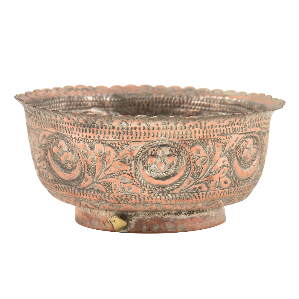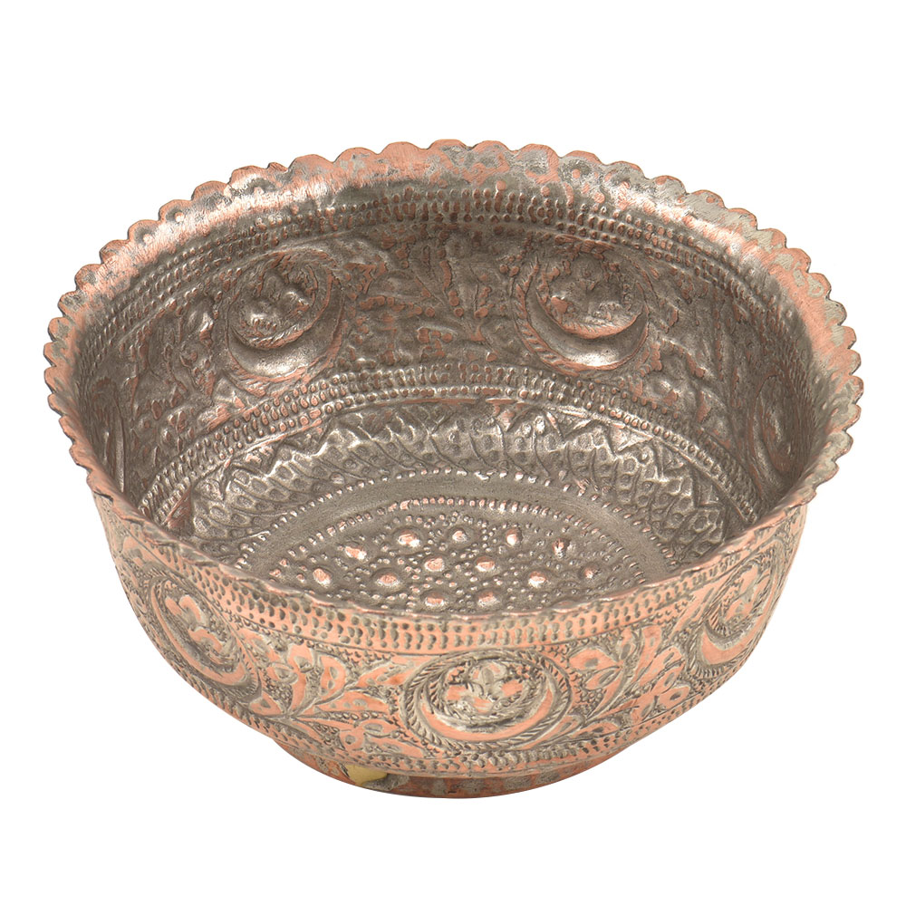 Here is a very elaborated Islamic style copper bowl most likely Persian style in origin Very detailed floral and geometrical decorations showing great craftsmanship with floral pattern on the exterior with scalloped edge.The handmade copper bowl is made by expert craftsmen of India is very decorative, great display, it can be used as fruit or flower bowl.