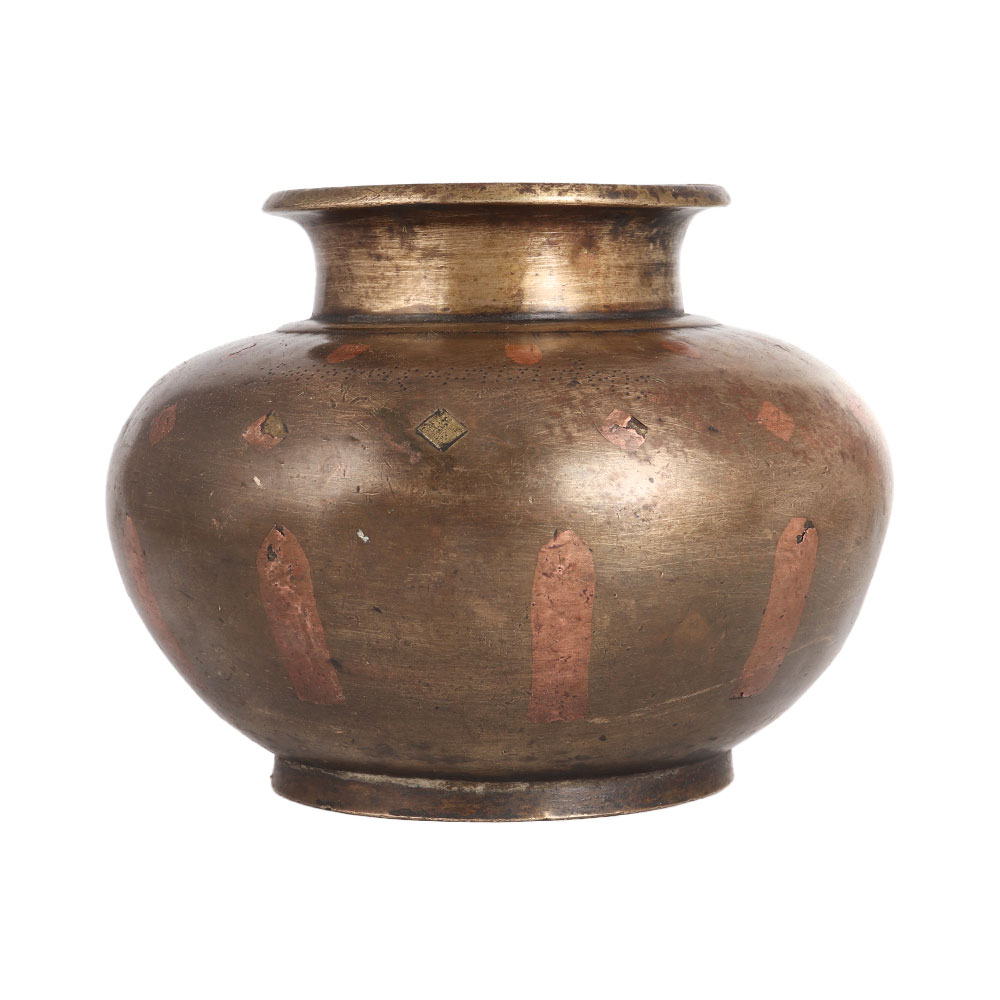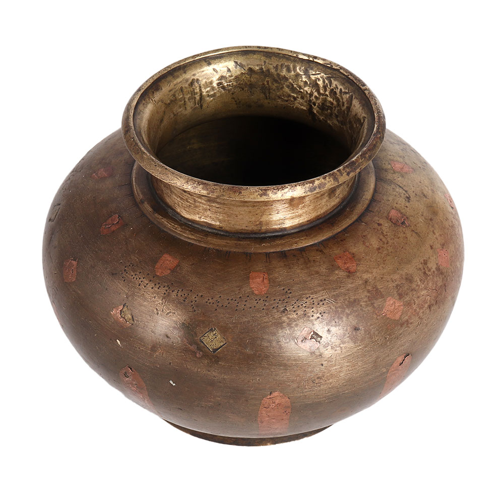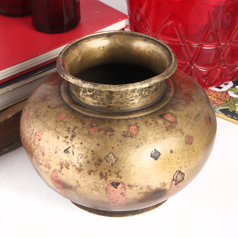 A water pot or lota made of high quality brass with carvings of copper. In India, water pots made of brass and copper are known as Ganga Jamuna pots. Ganga Jamuna water pots are used for rituals, auspicious functions and havans to store sacred water. They are handmade by highly skilled Indian artisans from Himachal Pradesh using ancient methods. Water pots can be used as indoor flower pots for living room, hallway or patio garden. Antique finish makes it eye-catching for decoration and vintage collection. Place this exquisite piece on the table, reception counter, shelf or billing counter to add an alluring flair to the decor. A perfect gift for any special and festive occasion for your loved ones.
