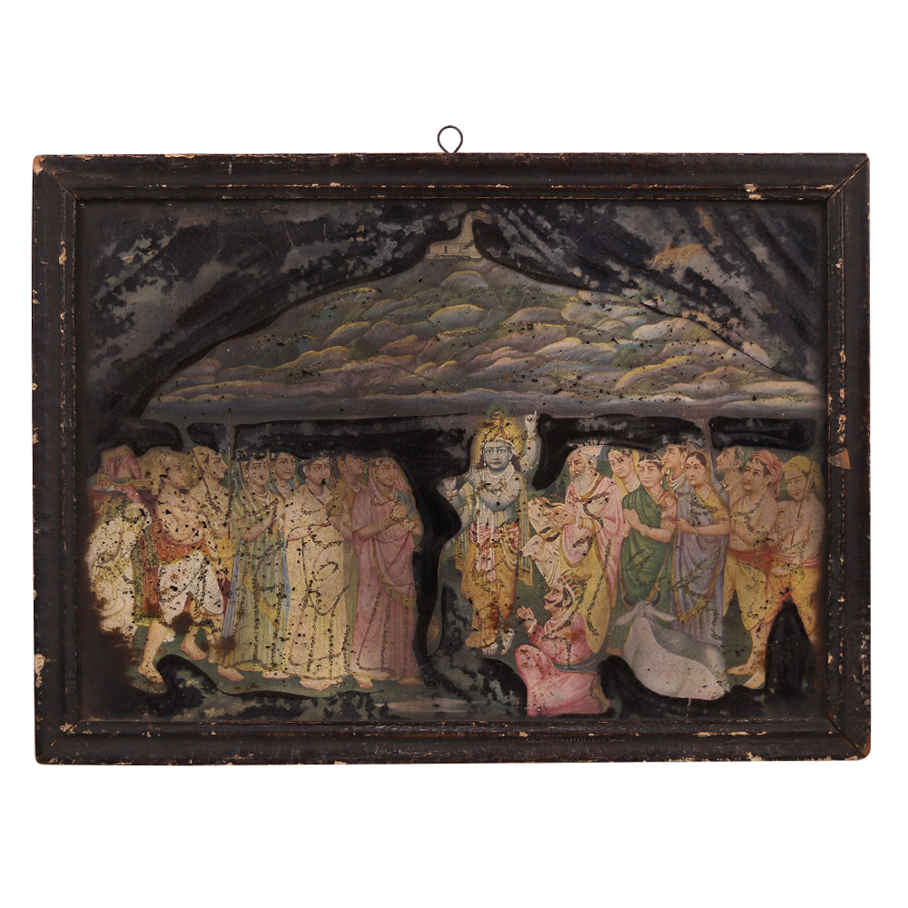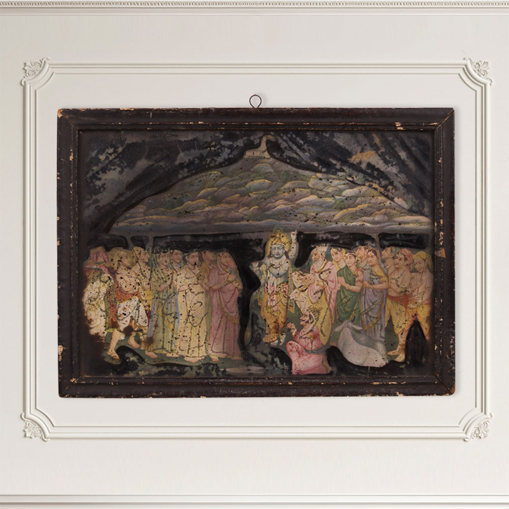 Prepare to be enchanted by the mesmerizing beauty of this vintage paper print of Lord Krishna and others, meticulously crafted onto a stunning glass painting. This extraordinary work of art is a true testament to the enduring power of traditional craftsmanship and the timeless allure of Indian spirituality. Immerse yourself in the serene and uplifting energy of this captivating artwork. The divine figures of Lord Krishna and his companions radiate a sense of peace, wisdom, and enlightenment, inviting you to connect with the profound spiritual teachings of the East. Display this masterpiece in your home or sacred space and allow its beauty to inspire and nourish your soul. Whether you're a collector of fine art, a devotee of Indian culture, or simply someone who appreciates the beauty of exceptional craftsmanship, this vintage paper print is a must-have addition to your collection. Elevate your space and enrich your life with this stunning, one-of-a-kind piece that will captivate and delight for years to come.