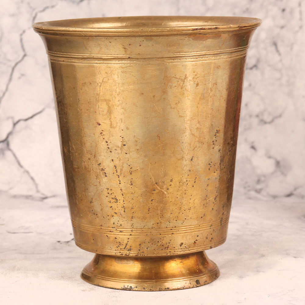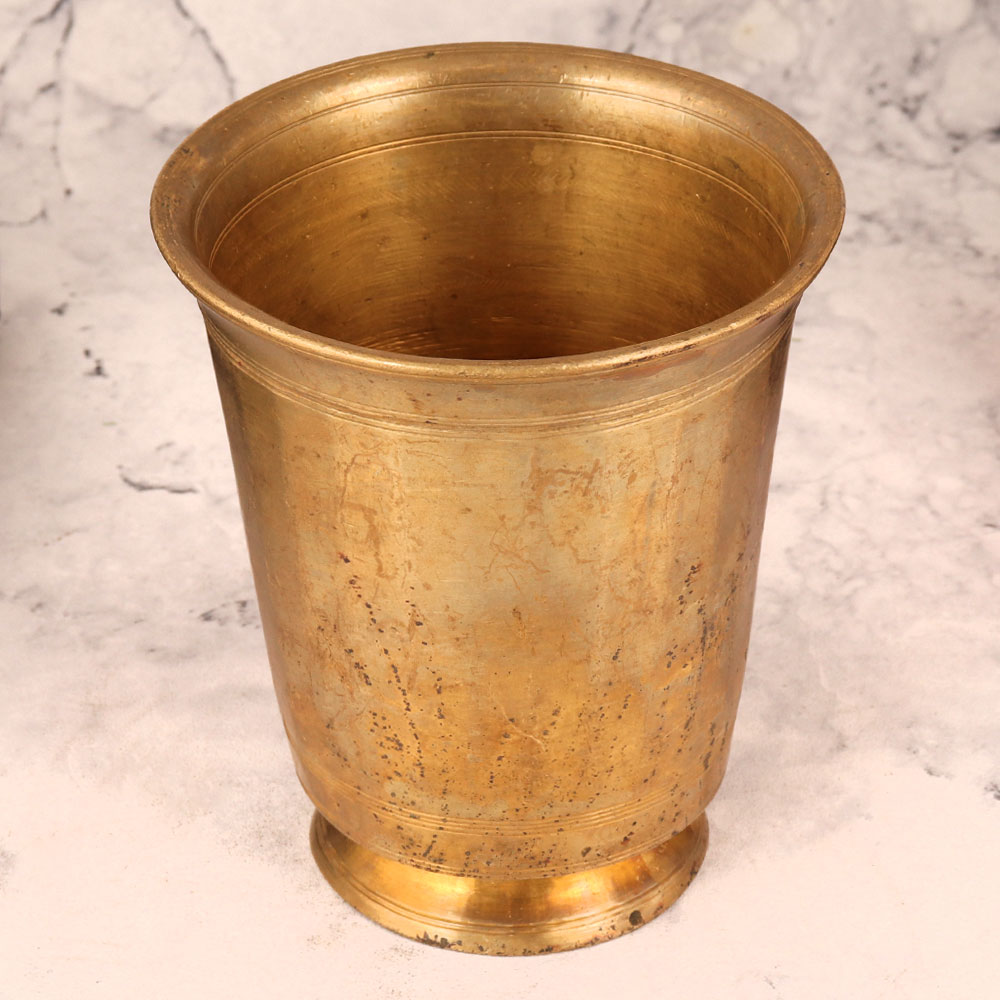 A vintage brass glass with an antique golden finish which is meticulously handmade by highly skilled and experienced Indian craftsmen hailing from the artistic realms of South India. Crafted from high-quality brass, this timeless artefact bears the heritage of traditional Pooja, havan, and rituals. With its ornate design and historical significance, this piece serves as more than just a ritual accessory—it doubles as an elegant decoration for your home, office, restaurant, hotel, shop, or cafe. Its versatility is striking, it can hold fragrant flowers, becoming a captivating flower pot that radiates charm. For ardent vintage collectors, this glass is a coveted treasure, a tangible link to the past. Its allure is not confined to private spaces, consider featuring it in exhibitions, where its beauty and cultural value can be appreciated by all. Moreover, this masterpiece makes for an ideal gift to mark special, festive, or auspicious occasions, symbolizing your best wishes and cultural appreciation. Own a piece of history, celebrate tradition, and bestow a heartfelt gift with this magnificent vintage brass glass.