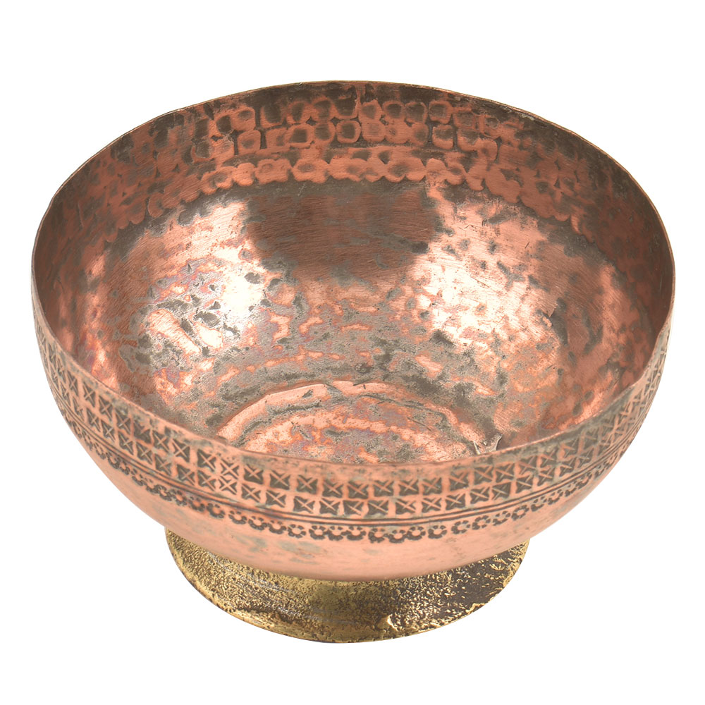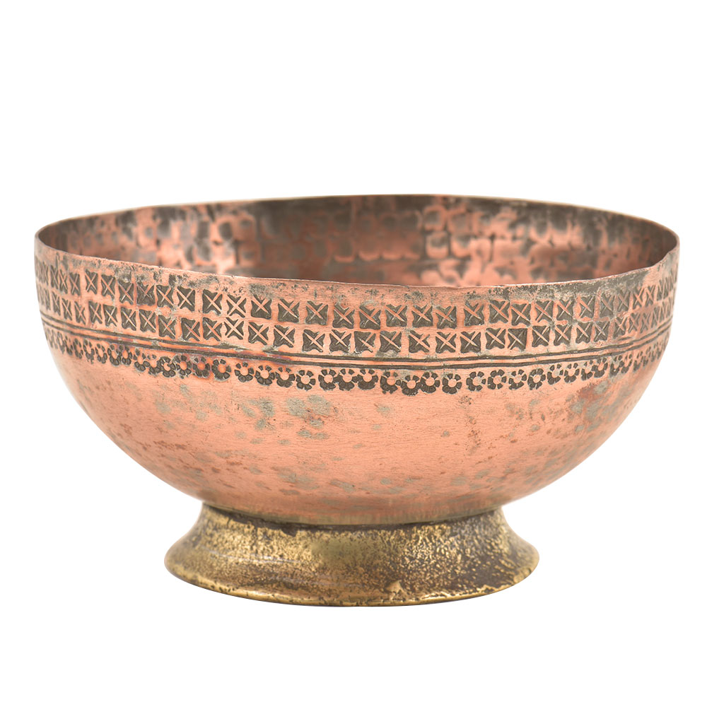 The hand hammered copper bowl is a Beautifully Unique Piece Complete with islamic style starry sun Pattern Design. The Perfect Addition to Any Set or Your Home Kitchen Decor. It has geometrical patterns to the side and base and a rolled over top rim of the bowl. The perfect addition to any set or your home kitchen decor.