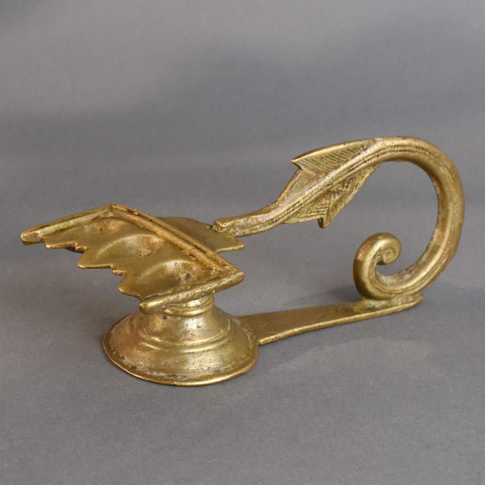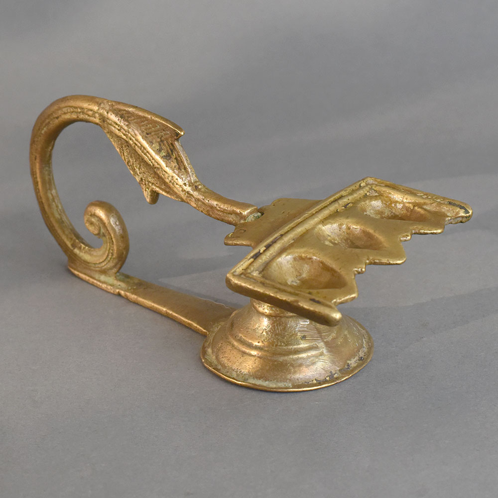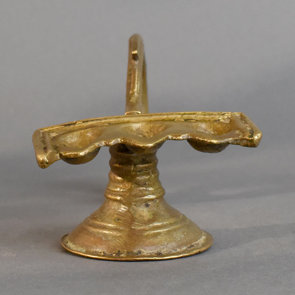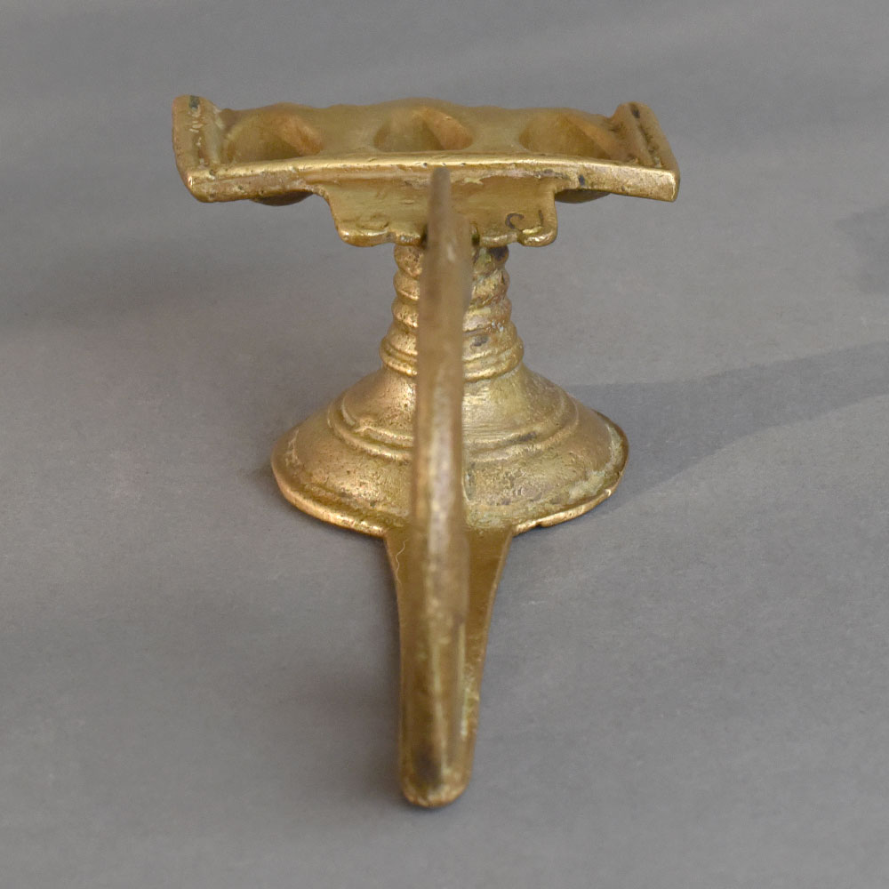 This vintage brass aarti oil lamp with handle is a timeless piece of devotional art, traditionally used in temples and homes during prayer rituals. It features three deep oil cavities designed to hold ghee or oil wicks, symbolizing light and divine energy. The lamp is crafted from solid brass, ensuring durability and an authentic antique appearance. Its gracefully curved handle, decorated with an arrow-like motif, makes it easy to hold while performing aarti, adding both functionality and charm. With its elegant design and spiritual significance, this lamp is perfect for pooja rooms, festive ceremonies, and cultural rituals. Beyond its religious use, it also serves as a collectible piece of heritage decor, reflecting the deep traditions of Indian craftsmanship.