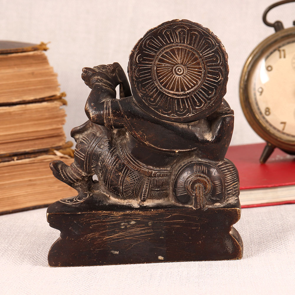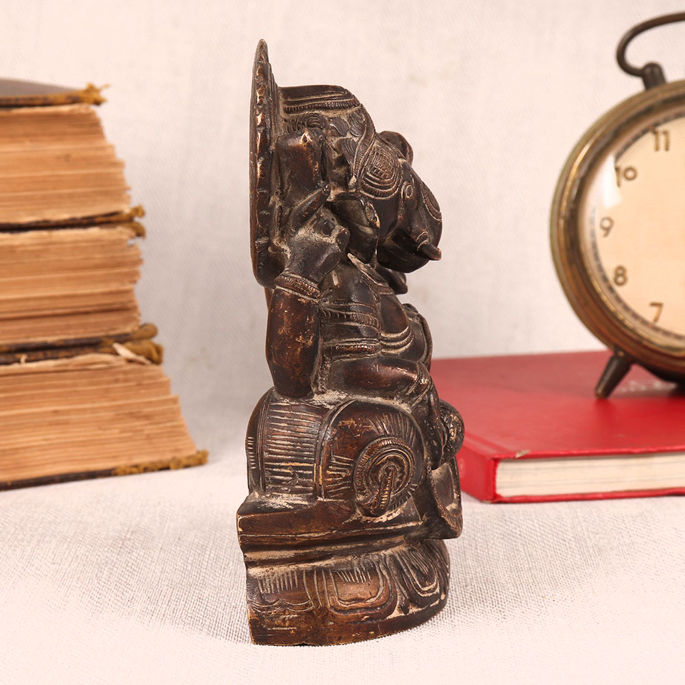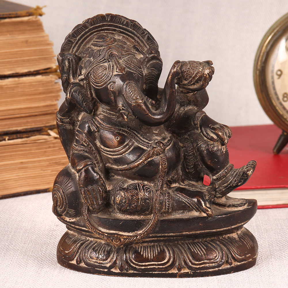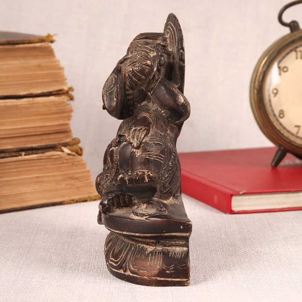 Buy a Vintage Brass Statue of Lord Ganesha online which is meticulously crafted by highly skilled and experienced Indian artisans. This exquisite masterpiece showcases Lord Ganesha seated regally on a platform, elegantly resting on a cushion in an antique brown finish. Crafted from high-quality brass, this statue radiates timeless beauty and craftsmanship. It embodies the rich cultural heritage of India, capturing the essence of spirituality and tradition. This versatile piece can enhance the ambiance of your home, office, restaurant, hotel, shop, or cafe. Place it in your prayer room as a divine symbol, or use it as a captivating decoration that adds a touch of vintage charm to any space. Perfect for vintage collectors, this statue is a conversation starter, making it an ideal addition to exhibitions. It's also a thoughtful gift for your family, friends or relatives on special, festive, or auspicious occasions, symbolizing blessings, prosperity, and the enduring spirit of Lord Ganesha. Bring home this extraordinary work of art and let the aura of Lord Ganesha's presence fill your space with grace and positivity.