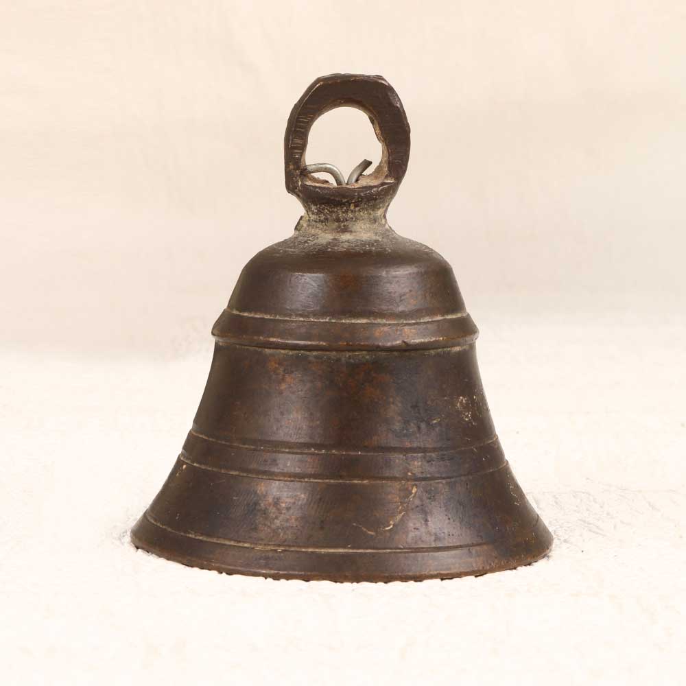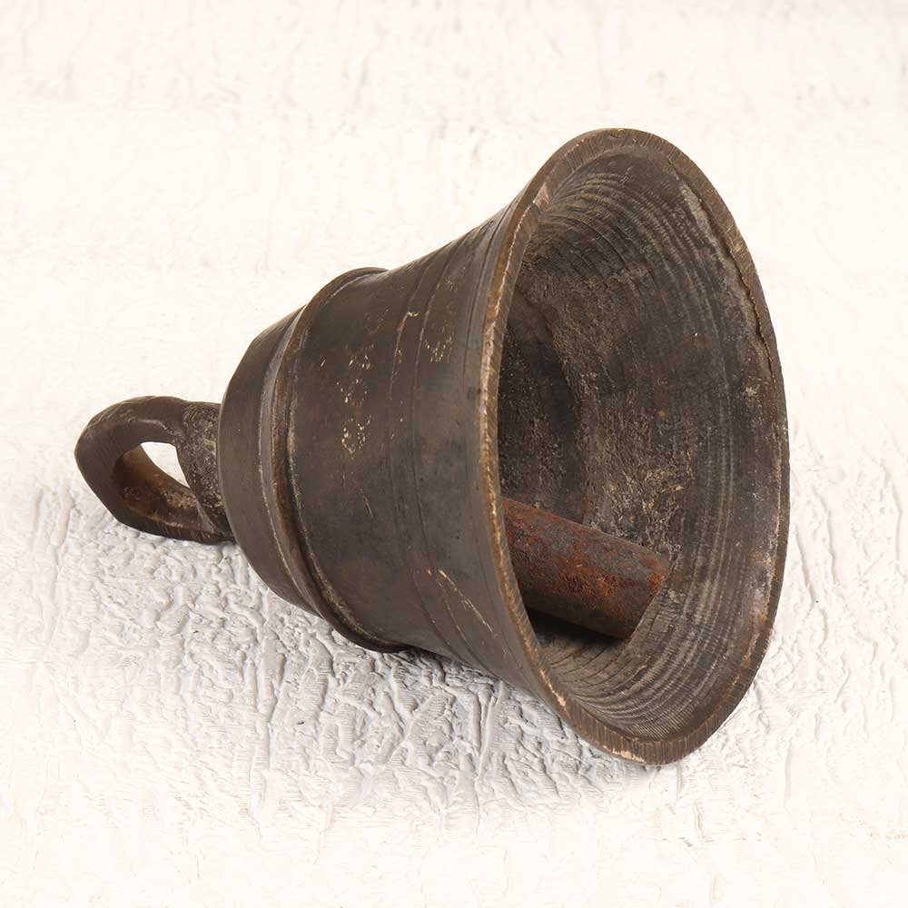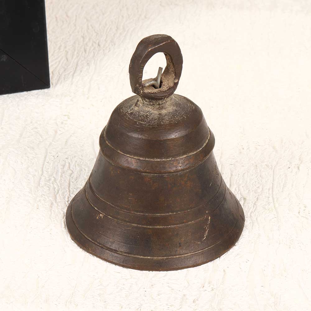 Add a divine touch to your home with this vintage bell metal temple bell handcrafted in Himachal, India. With its minimalist design and resonant tone, this authentic brass bell brings a peaceful, meditative quality to any space. Hang this wonderful vintage bell by a window or doorway and let gentle breezes set it ringing. The pleasant, meditative tone promotes relaxation and clears cluttered energies. Or actively ring it yourself and let the sound wash over you, transporting you to tranquility. With its authentic craftsmanship and spiritual character, this vintage Indian bell infuses traditional style into modern spaces. Yoga studios, meditation areas, and Zen retreats can benefit from its calming presence. Display it as decor or actively ring it to cultivate peaceful vibes wherever it hangs.