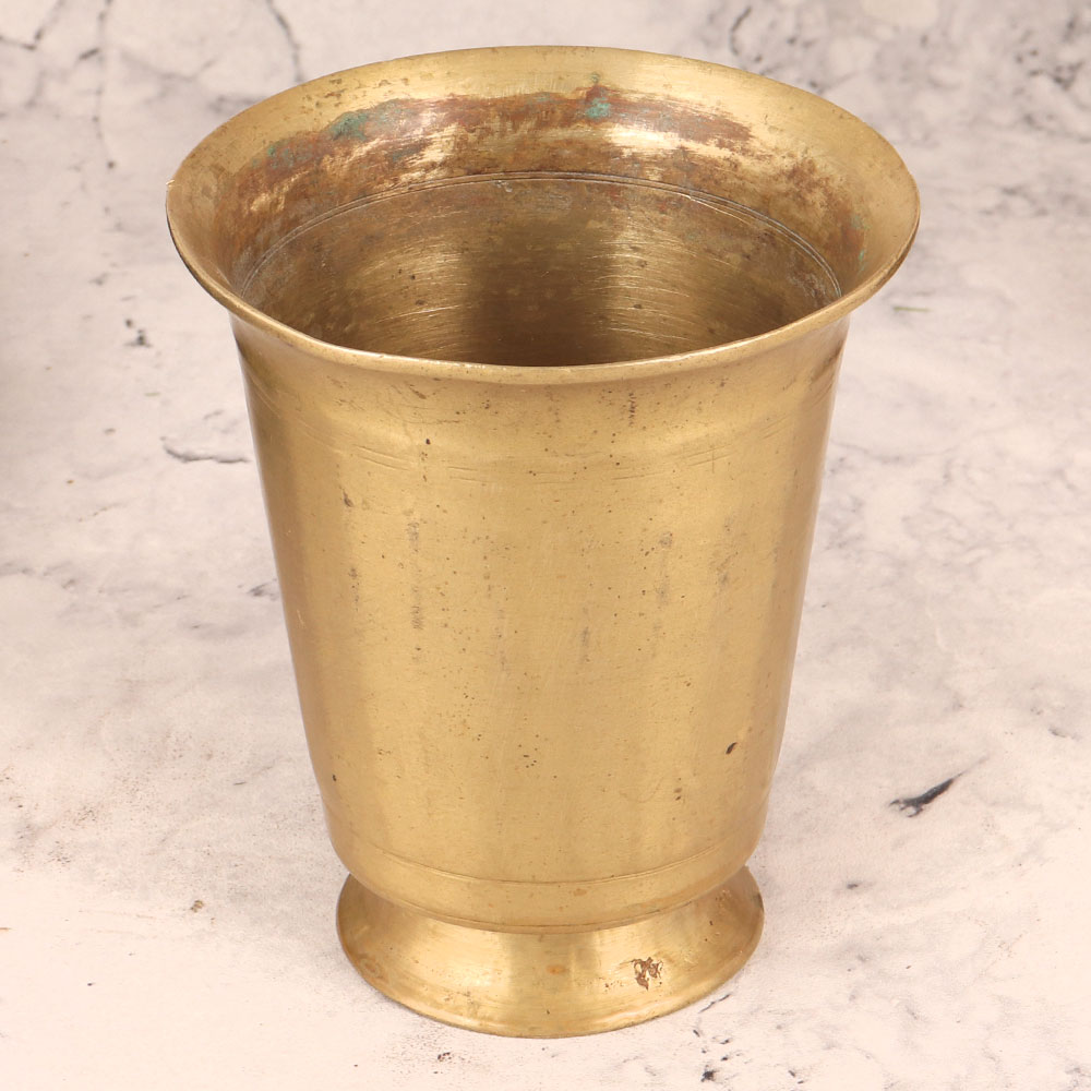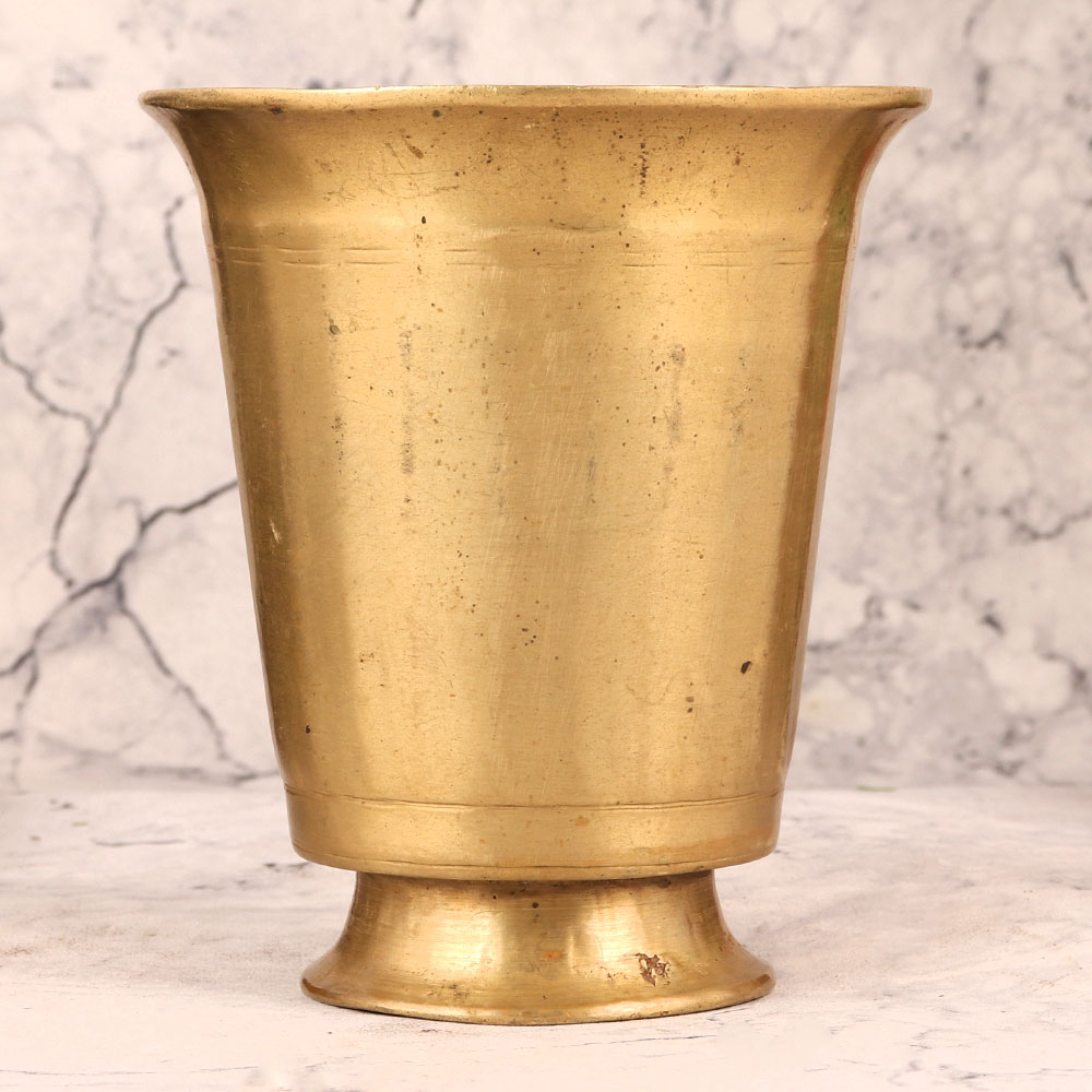 Buy a Vintage Brass Glass online that is a true testament to the craftsmanship of skilled Indian artisans from South India. Meticulously handcrafted, this piece boasts an antique golden finish, evoking the timeless charm of a bygone era. Forged from high-quality brass, this glass holds a significant place in traditional Indian rituals such as Pooja, Havan, and various ceremonies. Its versatile design makes it equally suitable for adorning your home, office, restaurant, hotel, shop, or cafe, adding a touch of regal elegance to any space. Beyond its spiritual utility, this brass glass also doubles as a charming flower pot, breathing life into your surroundings. It's a must-have for vintage collectors, a captivating piece for exhibition displays, and a thoughtful gift for family, friends or relatives on special, festive, or auspicious occasions. Embrace the rich heritage and artistry of South India with this Vintage Brass Glass, a timeless fusion of tradition and aesthetics that will grace your life with beauty and meaning.
