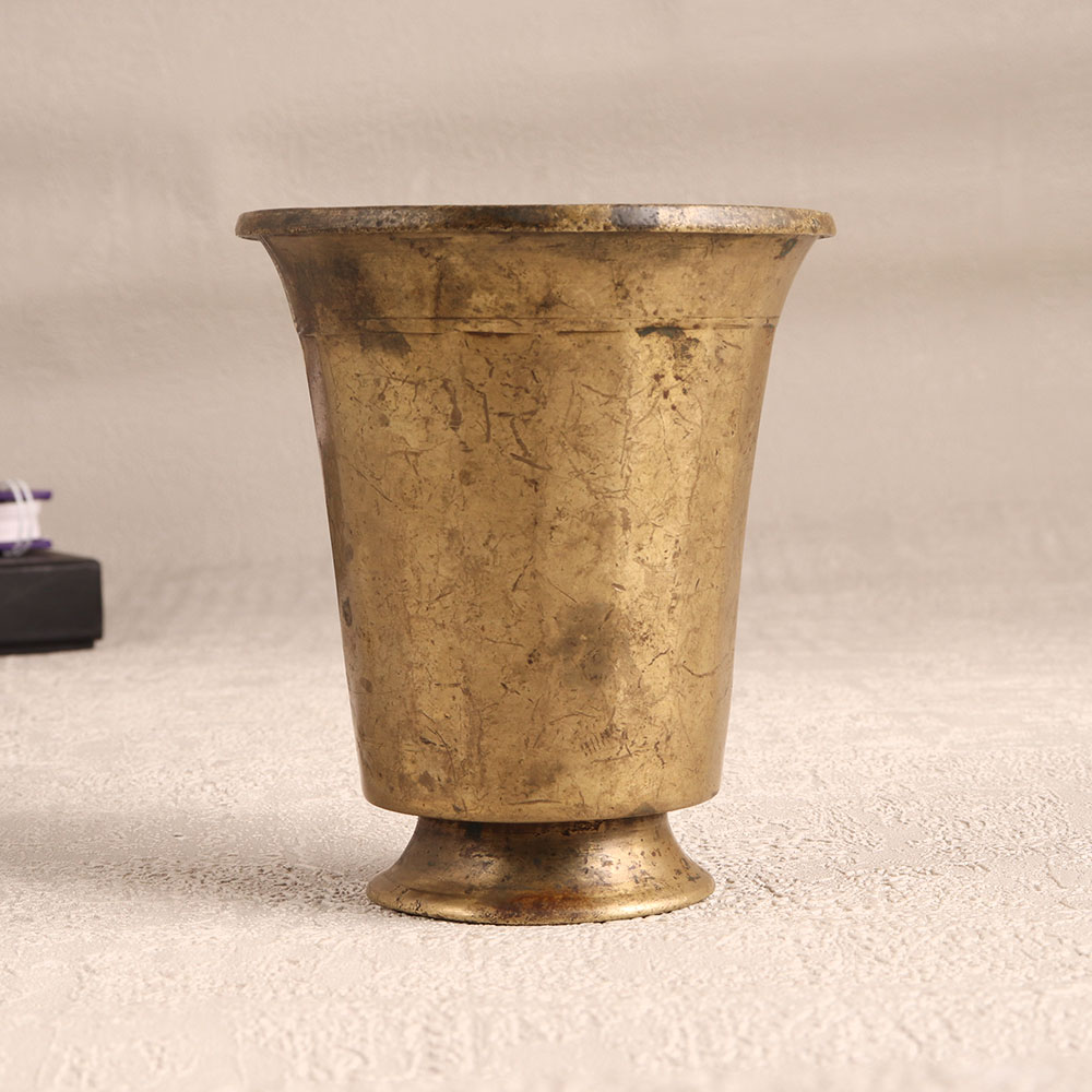 Add a touch of timeless elegance to your sacred space with this exquisite Vintage Brass Holy Water Glass. Meticulously crafted by highly skilled and experienced Indian artisans, this stunning piece of South Indian Art exudes a sense of reverence and tradition. Made from high-quality brass, it features a rich antique brown finish that adds character and authenticity to its vintage charm. This holy water glass serves a dual purpose. It is not only a vessel for holding holy water during prayers, havans, or rituals but also a versatile decor item that can adorn your home, office, restaurant, hotel, or cafe prayer room. Its intricate design and antique appeal make it a perfect choice for flower decoration, adding a touch of sophistication to any setting. Furthermore, this handcrafted masterpiece makes for a thoughtful and meaningful gift for your family, friends or relatives on special, festive, or auspicious occasions. Embrace the beauty and spirituality of Indian craftsmanship with this Vintage Brass Holy Water Glass.