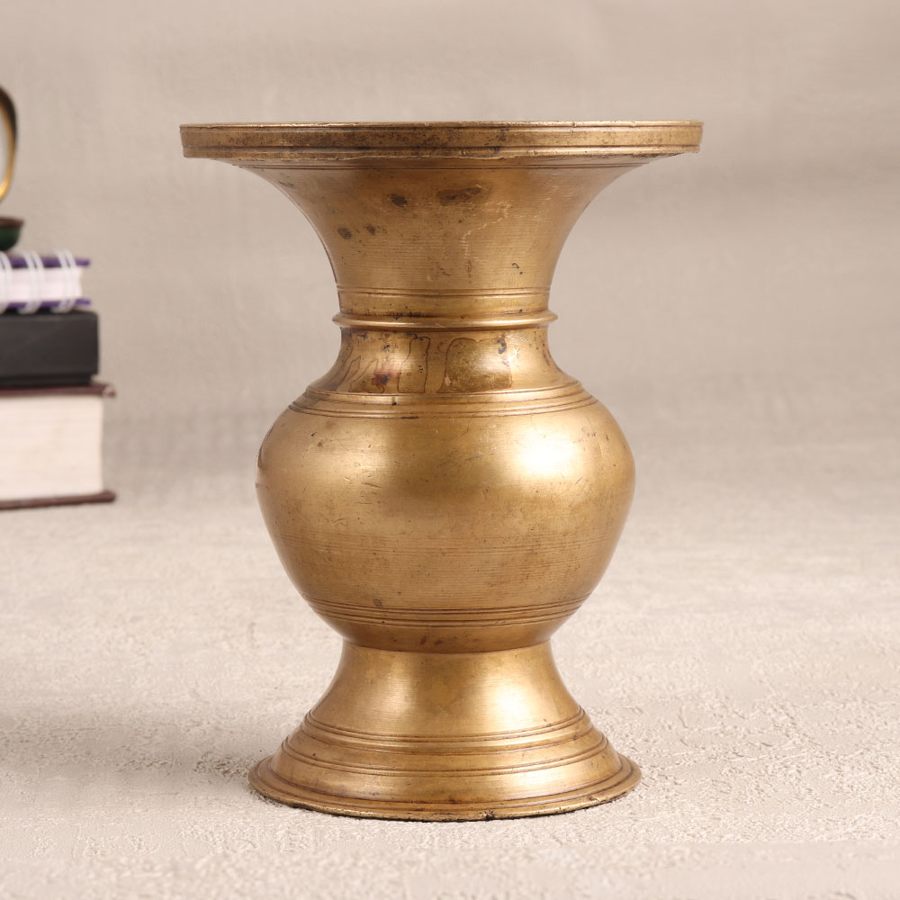 Buy a Vintage Brass Holy Pot online that is a masterpiece of craftsmanship in antique brown finish. Handmade by professional Indian artisans with a deep-rooted tradition in South Indian Art, this brass pot is a testament to their expertise and dedication to preserving heritage. Crafted from high-quality brass, this pot not only serves as a stunning decorative piece but also offers functionality. Use it as a unique flower pot, breathing life into your home, office, restaurant, hotel, or cafe. Its timeless design seamlessly complements various interior styles, adding a touch of elegance and mystique to any space. This holy pot is not just a decorative item, it's a conversation starter, a collectible for vintage enthusiasts, and an excellent addition to exhibitions. Its cultural significance and intricate detailing make it a prized possession for those who appreciate art and history. Looking for a thoughtful gift? Share the beauty and spirituality of this brass pot with your family, friends or relatives on special, festive, or auspicious occasions. Embrace the allure of this antique masterpiece and infuse your surroundings with a touch of Indian heritage and artistry.