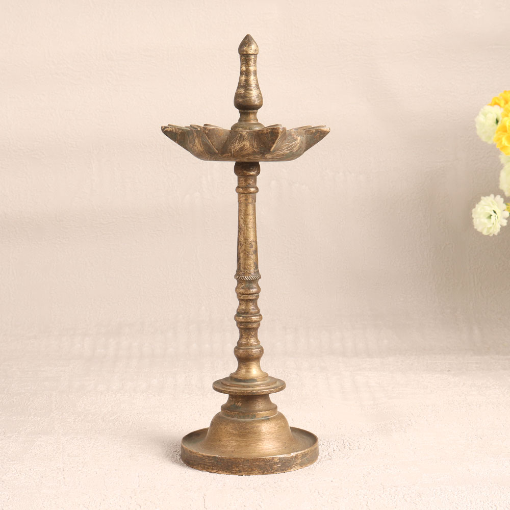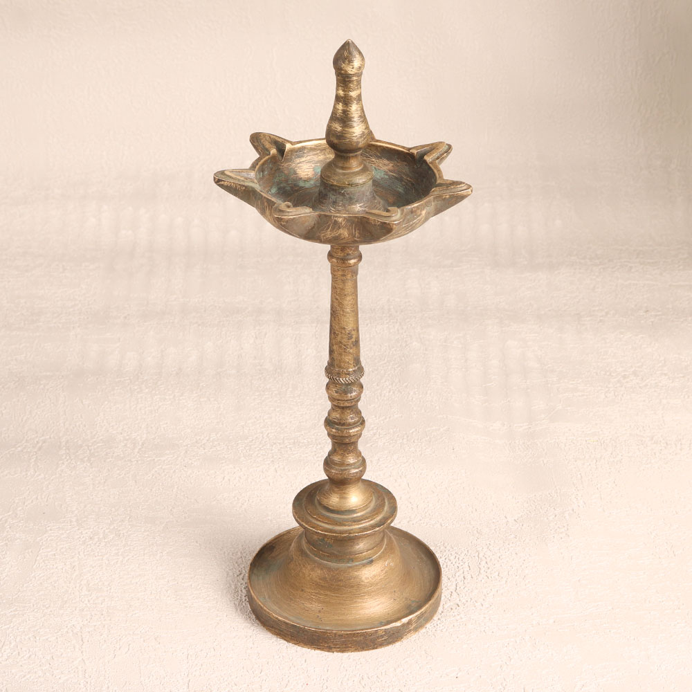 This Vintage Brass Oil Lamp is a stunning embodiment of South Indian artistry. Handcrafted by highly talented Indian artisans, this lamp showcases their craftsmanship and attention to detail. Its antique brown finish adds a touch of old-world charm and elegance. This lamp is not just a decorative piece, it's a functional work of art. Featuring seven jyots (lamps), it can be lit using traditional materials like mustard oil or ghee and cotton wicks. The warm, flickering glow it produces creates a soothing and inviting atmosphere, making it perfect for use at home, office, hotels, cafes, shops, restaurants, or prayer rooms. Whether placed as a centerpiece or displayed in a vintage collection or exhibition, this lamp stands out as a timeless masterpiece. It's ideal for use during prayers, auspicious occasions, or even as a thoughtful gift for your family, friends or relatives during special, festive, or celebratory moments. Embrace tradition, art, and spirituality with this Vintage Brass Oil Lamp.