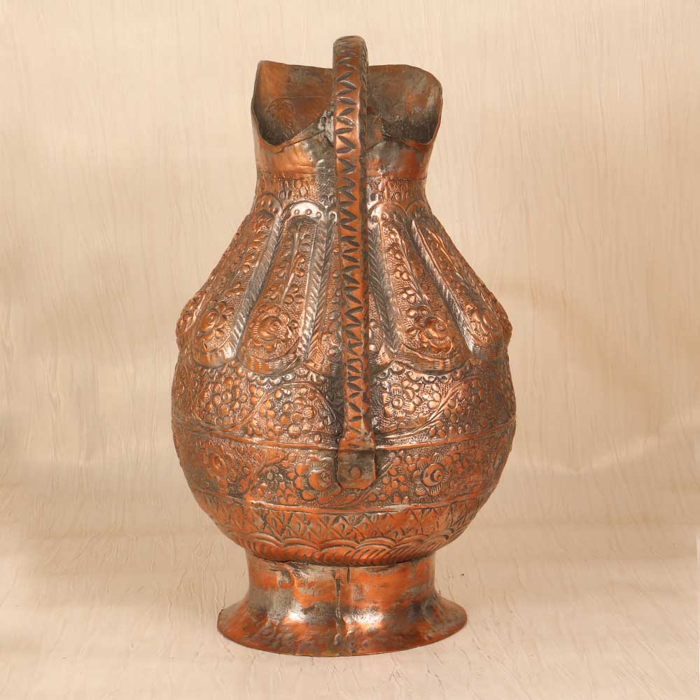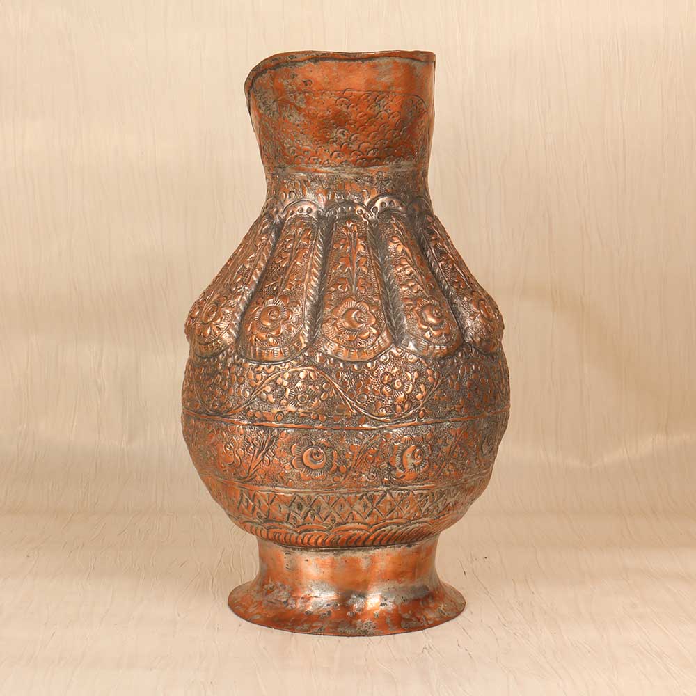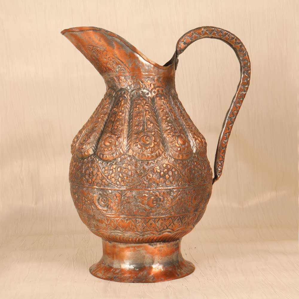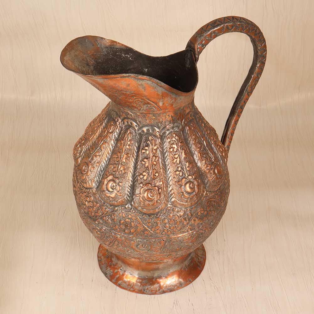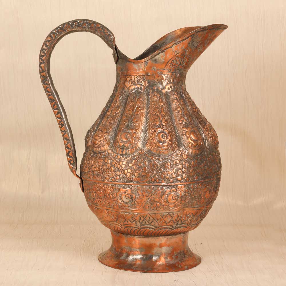 Step back in time with this antique-inspired engraved copper jug. Lovingly handcrafted using traditional techniques, this stunning jug evokes the exotic bazaars of the ancient Middle East. This special jug features mesmerizing engraved patterns reminiscent of flowing floral designs, geometric shapes and Arabic script. The motifs reflect advanced metalworking skills and artistic traditions passed down through generations. A true work of art, every detail was intricately carved by a skilled artisan. Whether displayed as an accent piece or used decoratively, this copper jug adds a touch of timeless intrigue and handcrafted appeal to any space. For collectors and designers alike, it's a rare find that tells a story of ancient artistry and craftsmanship. Make this engraved jug the star of your home decor.