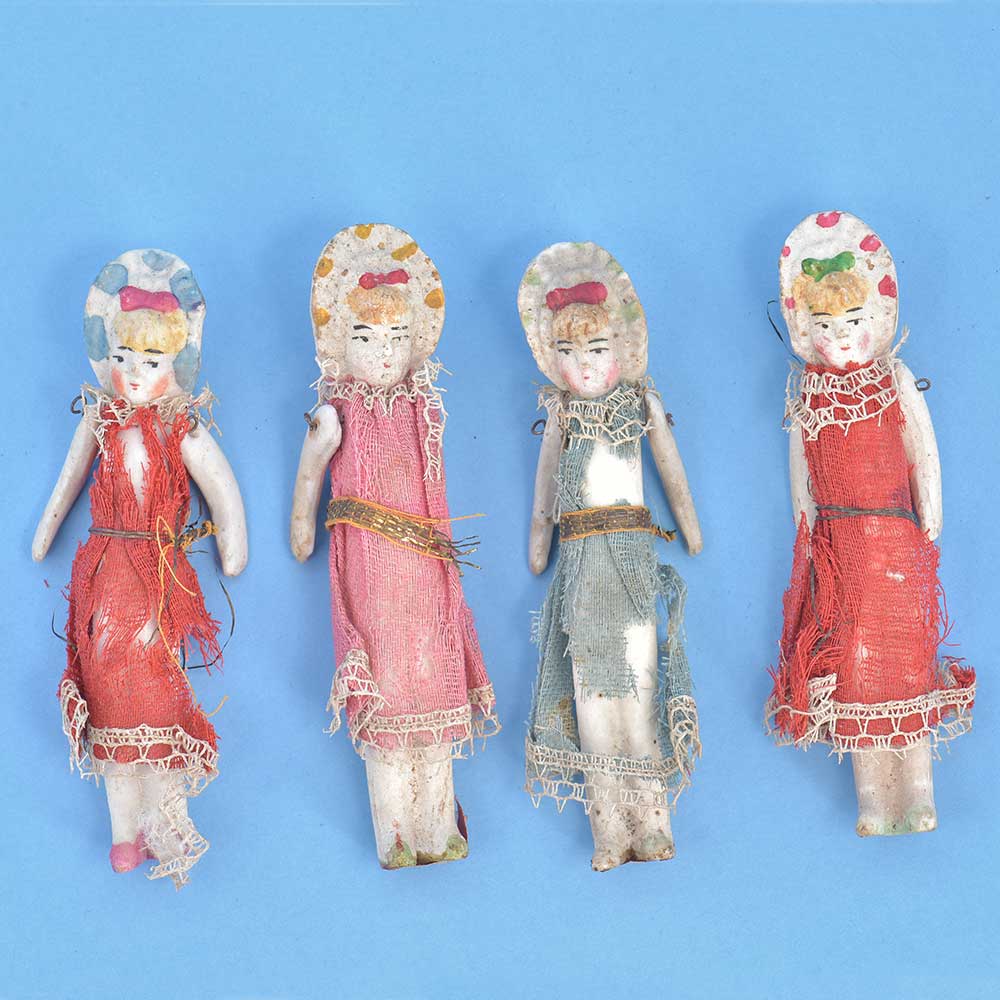The dolls are very old and are made in porcelain it is available in a set of 4 with a country look in terms of hair style and the kind of clothes that have been worn by them. A veery rare and beautiful collection to be displayed at home or gifted to your near and dea ones.