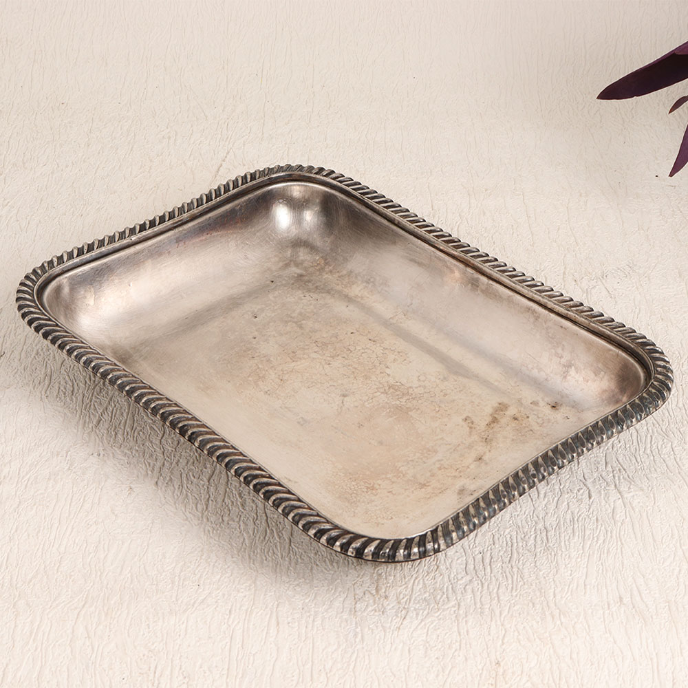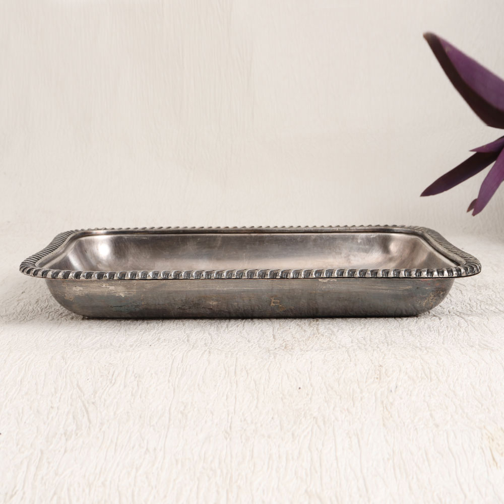 Enhance your home, office, or dining experience with this exquisite Vintage White Metal Food Tray. Crafted in a classic rectangle shape, this tray is a masterpiece of English Art, lovingly handmade by talented artisans. Its intricate patterns on the edges, finished in antique silver, add a touch of timeless elegance to any setting. Meticulously fashioned from high-quality white metal, this tray serves both form and function. It's not just a practical addition to your dining or serving needs, it's a work of art that exudes a sense of sophistication and nostalgia. Whether you're decorating your home, office, hotel, cafe, shop, or restaurant, this tray's versatile design complements any environment. For collectors of vintage treasures, this tray is a must-have addition, enriching your curated assortment with its historic charm. Furthermore, it makes a meaningful gift for your family, friends or relatives during special, festive, or auspicious occasions. Embrace the allure of the past while infusing style into your present with this Vintage White Metal Food Tray.