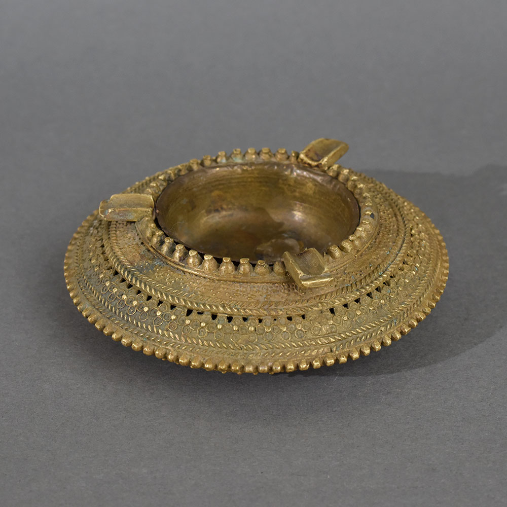 This vintage brass tribal ashtray is a stunning example of traditional Indian metalwork, capturing the essence of indigenous craftsmanship. The round, shallow bowl is framed by intricately embossed concentric rings featuring floral, beaded, and rope motifs, each etched by hand with impeccable precision. The ashtray’s surface bears the patina of age, enhancing its authentic and rustic appeal. Designed for function and beauty, this ashtray features three symmetrical rests for cigars or incense, perfectly blending utility with design. Whether used in a smoking lounge, sacred space, or as a conversation-starting décor piece, it adds cultural richness and artisanal charm to any setting. A rare collectible from tribal India, this ashtray is ideal for vintage collectors, antique dealers, and enthusiasts of ethnic art.