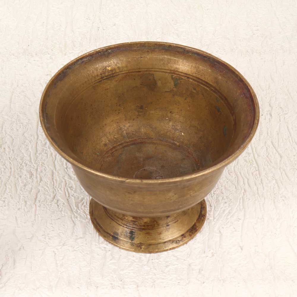 Elevate your pooja space with this vintage-inspired brass kumkum cup, handcrafted in the classic South Indian style. With its slender, curving shape and intricately worked brass body, this cup adds a traditional touch of beauty to your home mandir. The cup's wide, sturdy base provides stability when applying kumkum or holy ash. Its smooth, uniform finish allows the powder to glide on satisfyingly. The cup's rounded rim makes it easy to grasp and use. This is a kumkum cup made to last, crafted from solid brass by skilled artisans. Its vintage design harkens back to old-world South Indian craftsmanship, bringing an authentic feel to your rituals. Add meaning and elegance to your pooja with this handmade accent piece. Its vintage styling and artisanal origins make it a unique, cherished item for your worship space.