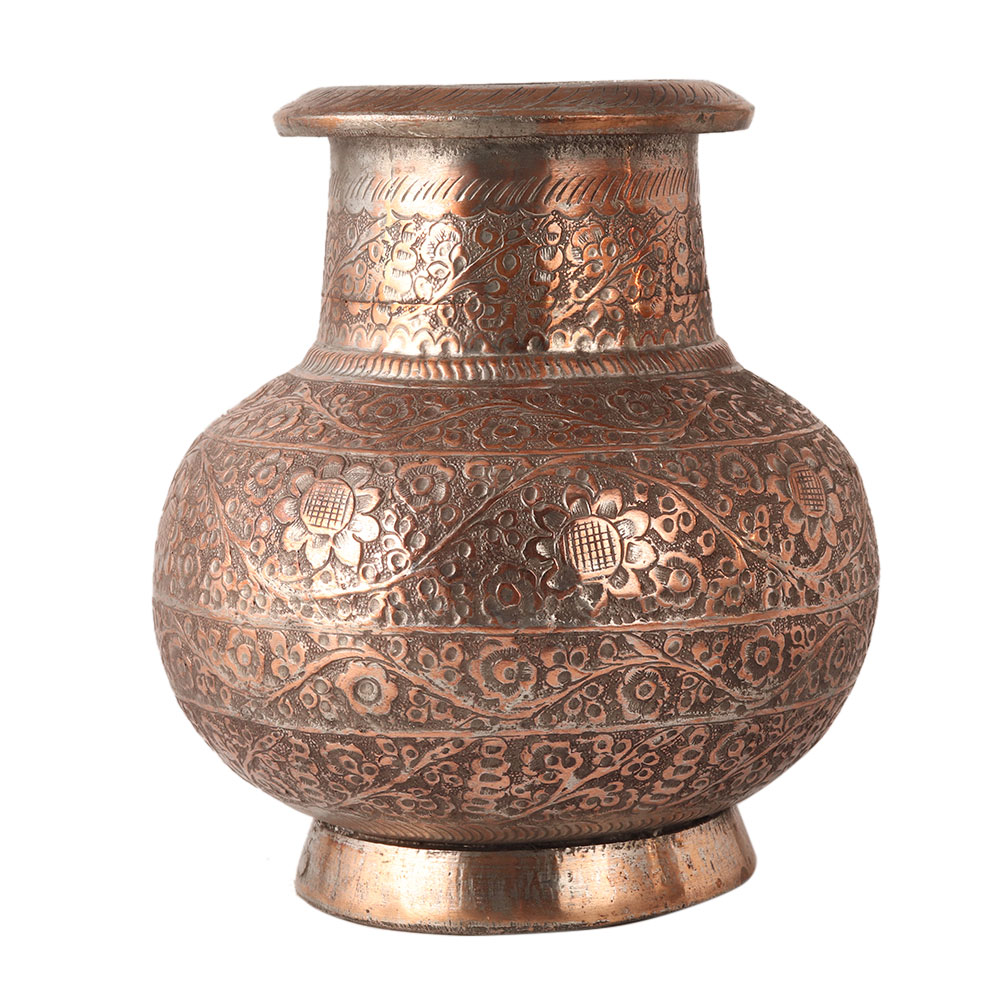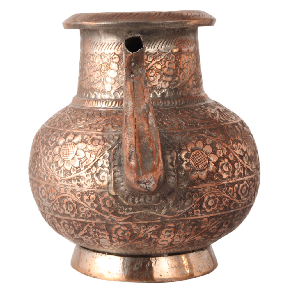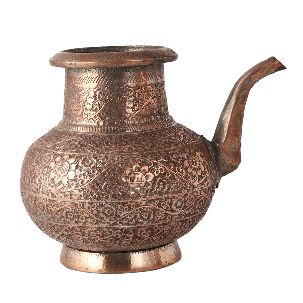 This holy water pot is engraved with beautiful floral patterns, an Islamic art. It is made of copper. A perfect gift for wedding celebrations. A must have for your collection.