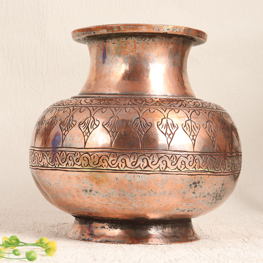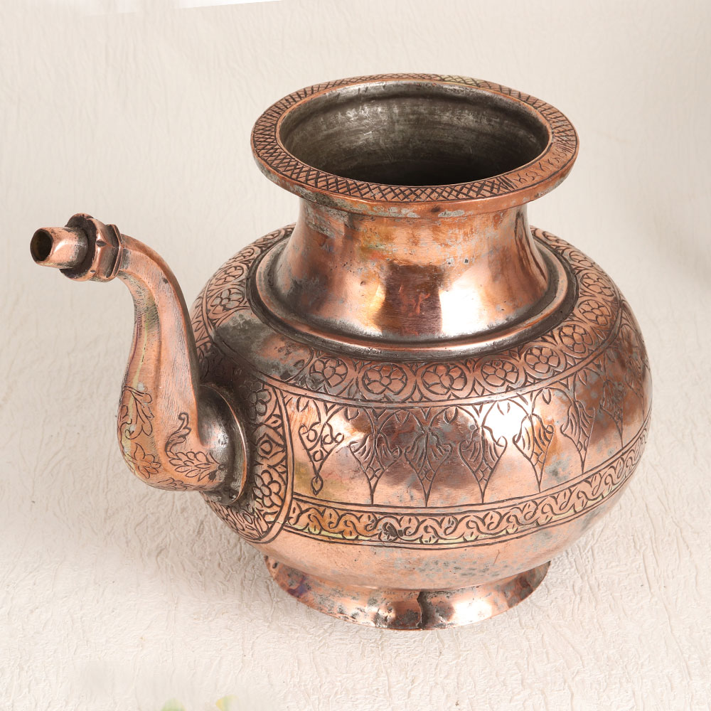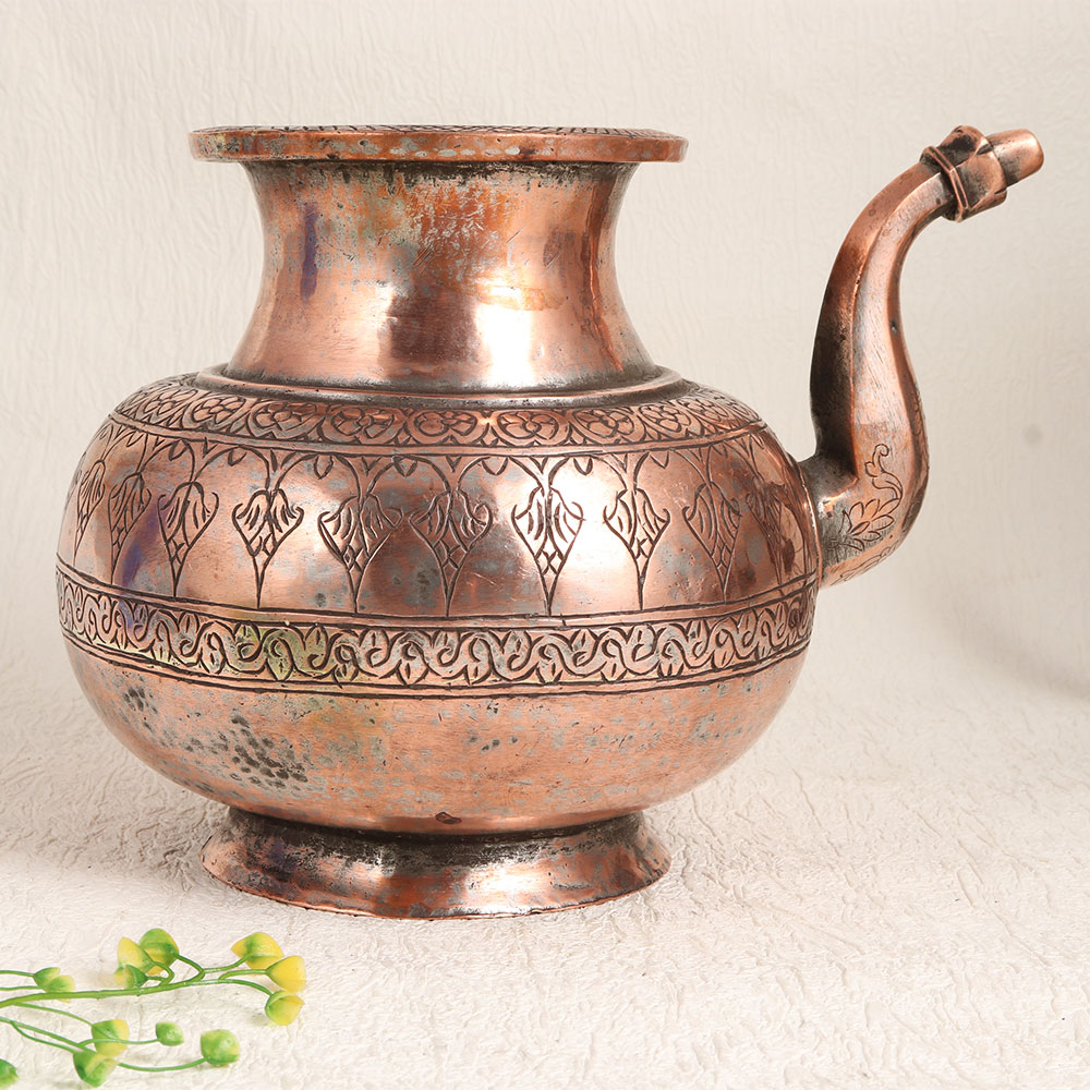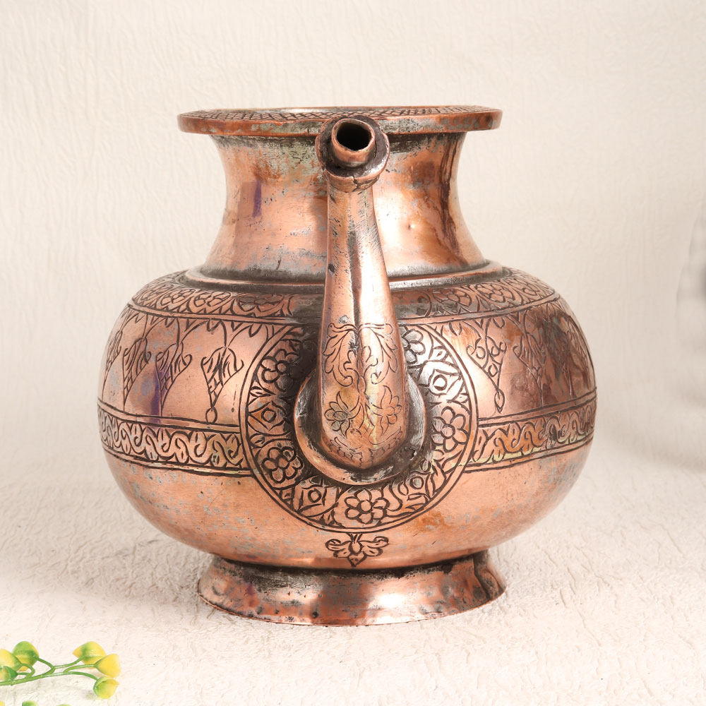 Buy a Vintage Copper Holy Water Pot online that is a masterpiece of Islamic Art crafted by highly skilled and experienced artisans with meticulous attention to detail. This timeless piece boasts a rich antique brown finish that exudes an air of old-world charm, making it a versatile addition to any setting. Handcrafted using high-quality copper, this pot is not just a decorative piece but also a symbol of craftsmanship and tradition. Its delicately engraved patterns showcase the intricate artistry that has been passed down through generations. The pot's convenient spout design adds both functionality and elegance, allowing it to be used for various purposes. Whether adorning your home, office, restaurant, hotel, cafe, or shop, this piece will captivate and inspire. It can serve as a decorative vase for your favourite blooms, a cherished item for havan, prayer, or temple ceremonies, or a unique addition to your vintage collection or exhibition. Furthermore, this Vintage Copper Holy Water Pot makes for a thoughtful and meaningful gift on special, festive, or auspicious occasions, expressing your appreciation for your family, friends or relatives with a touch of timeless artistry and culture. Embrace the heritage and beauty embodied in this copper masterpiece and elevate your surroundings with its enduring grace.