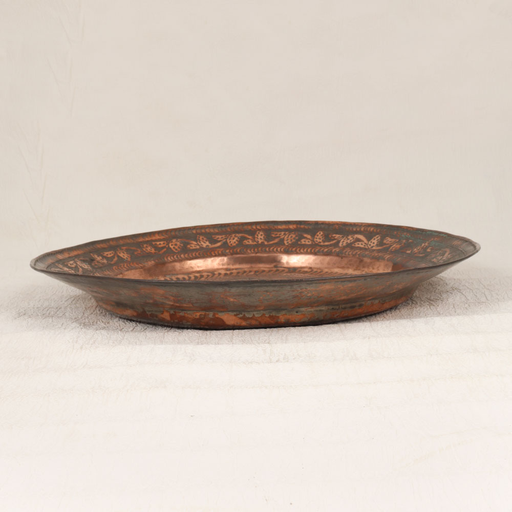 Adorn your home interior with our exquisite Vintage Copper Round Tray that is a masterpiece meticulously handcrafted by highly skilled and experienced Indian artisans in the timeless tradition of Islamic art. This tray is a celebration of craftsmanship and heritage, made from high-quality copper that not only ensures durability but also exudes an undeniable charm with its antique brown finish. The tray's surface is adorned with intricate engravings, reflecting the rich cultural influences of Islamic art. This unique piece seamlessly blends history with modern aesthetics, making it a versatile addition to any space. Whether adorning your home, office, restaurant, hotel, or cafe, this tray serves as a captivating focal point, adding a touch of opulence to your surroundings. Perfect for collectors of vintage treasures, the tray invites you to embark on a journey through time, capturing the essence of bygone eras. Furthermore, it serves as an ideal gift for your family, friends or relatives on special, festive, or auspicious occasions, expressing your appreciation for both artistry and meaningful connections. Embrace the elegance of the past and make a statement with this Vintage Copper Round Tray, a timeless testament to the craftsmanship of Indian artisans.