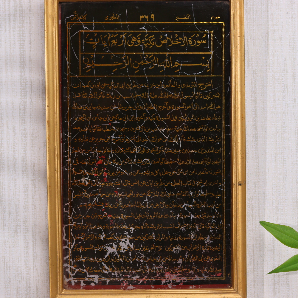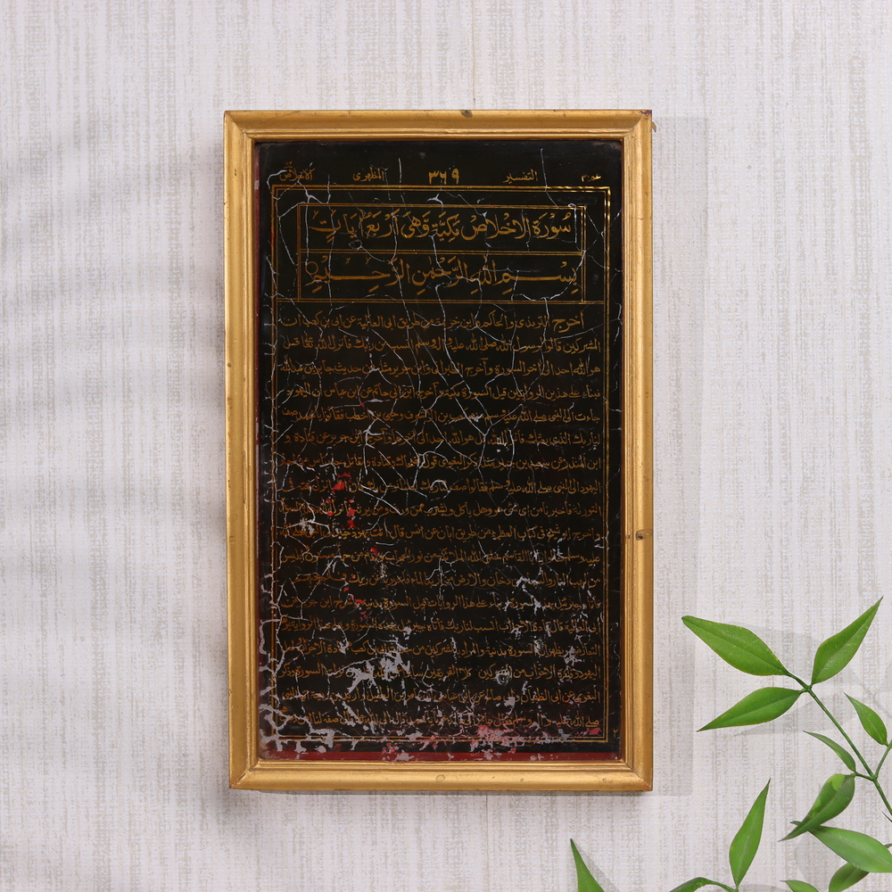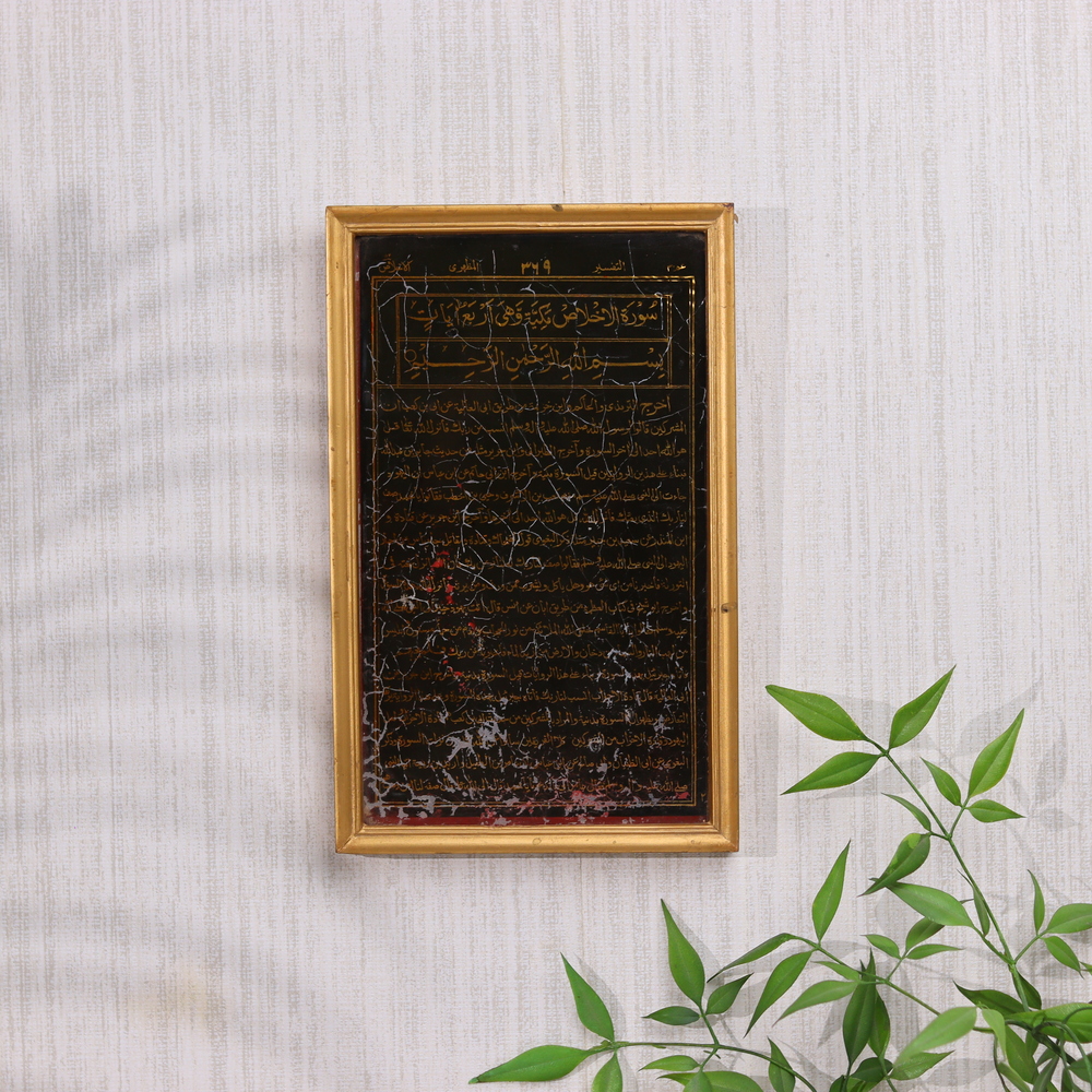 Prepare to be mesmerized by the captivating beauty of this vintage glass negative showcasing intricate Islamic calligraphy prayers. Preserved in a handsome wooden frame, this one-of-a-kind piece transports you to a world of profound cultural and spiritual significance. Lose yourself in the flowing strokes of the calligraphic script, each one a testament to the skill and dedication of the original craftsman. This stunning glass negative is more than just a piece of wall decor - it's a window into a realm of profound spiritual expression and cultural tradition. Whether you're looking to elevate your personal space or seeking a meaningful gift for a loved one, this vintage glass negative is a must-have addition to your collection. Proudly display it in your home or office, and let it inspire you with its timeless beauty and captivating allure. Secure your piece of history today and experience the transformative power of Islamic calligraphy.