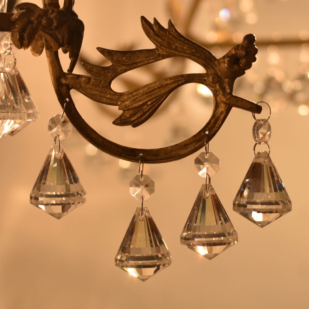 This beautiful Italian-style enameled Chandelier is the perfect addition to any room. The gilded ceiling light is accented with crystal drops and a chandelier base. Vintage brass fixtures look great in a classic setting or modern style home. The Italian-style enameled Chandelier features a beautifully gilded vintage brass ceiling fitting, with elegant crystal drops that are sure to add a touch of elegance and luxury to any room. This stunning chandelier is sure to impress any guest or have the perfect mood lighting for your space. This crystal chandelier is hand-crafted with artisanal techniques. The colors are gilded and the crystals are set in a fern pattern to create an elegant look. Beautiful multi-faceted crystals, clear and sparkling make this chandelier a statement maker. This magnificent light fixture provides an elegant and timeless look for your space.