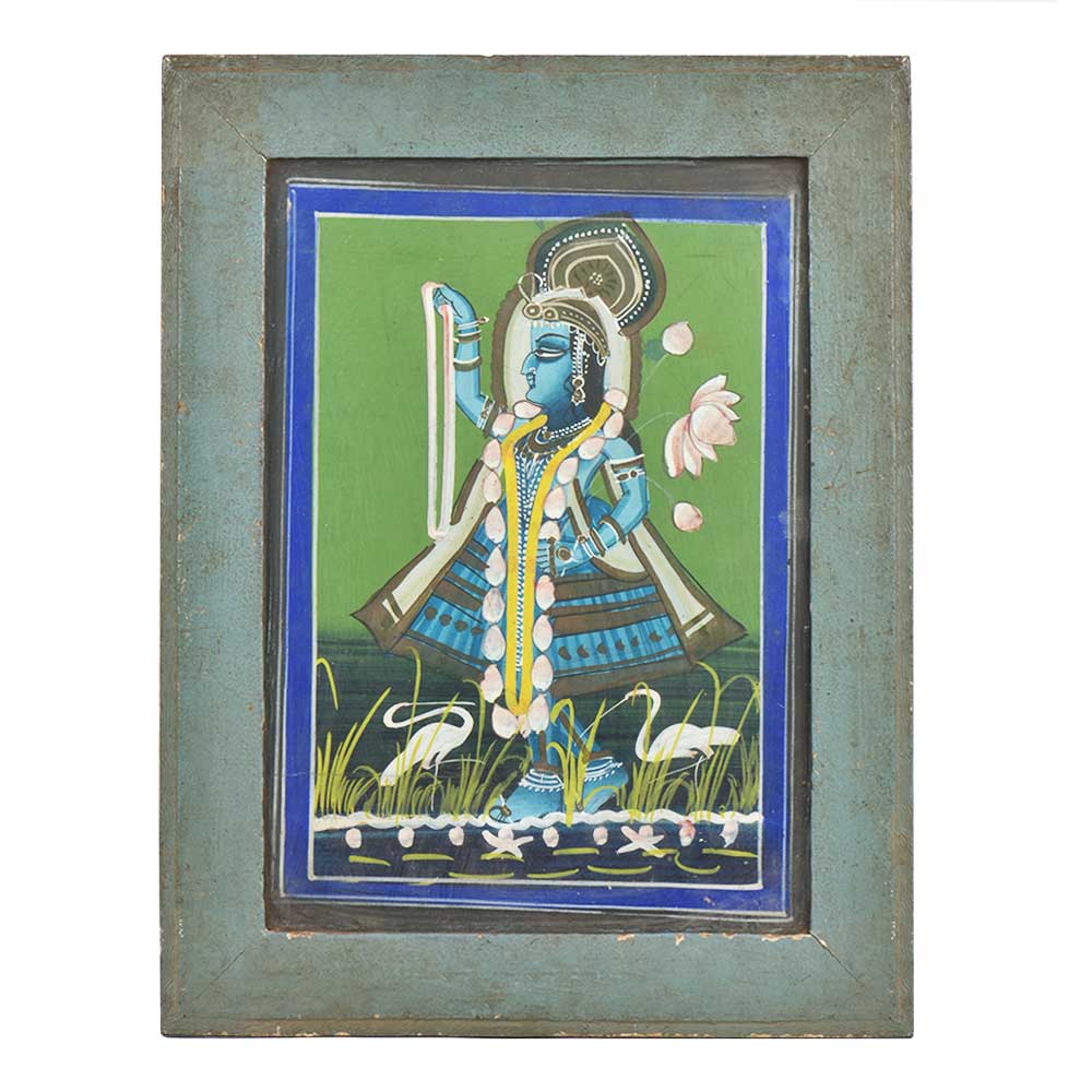 A vintage Goddess Yamuna painting greeting Lord Krishna with a garland of flowers.
