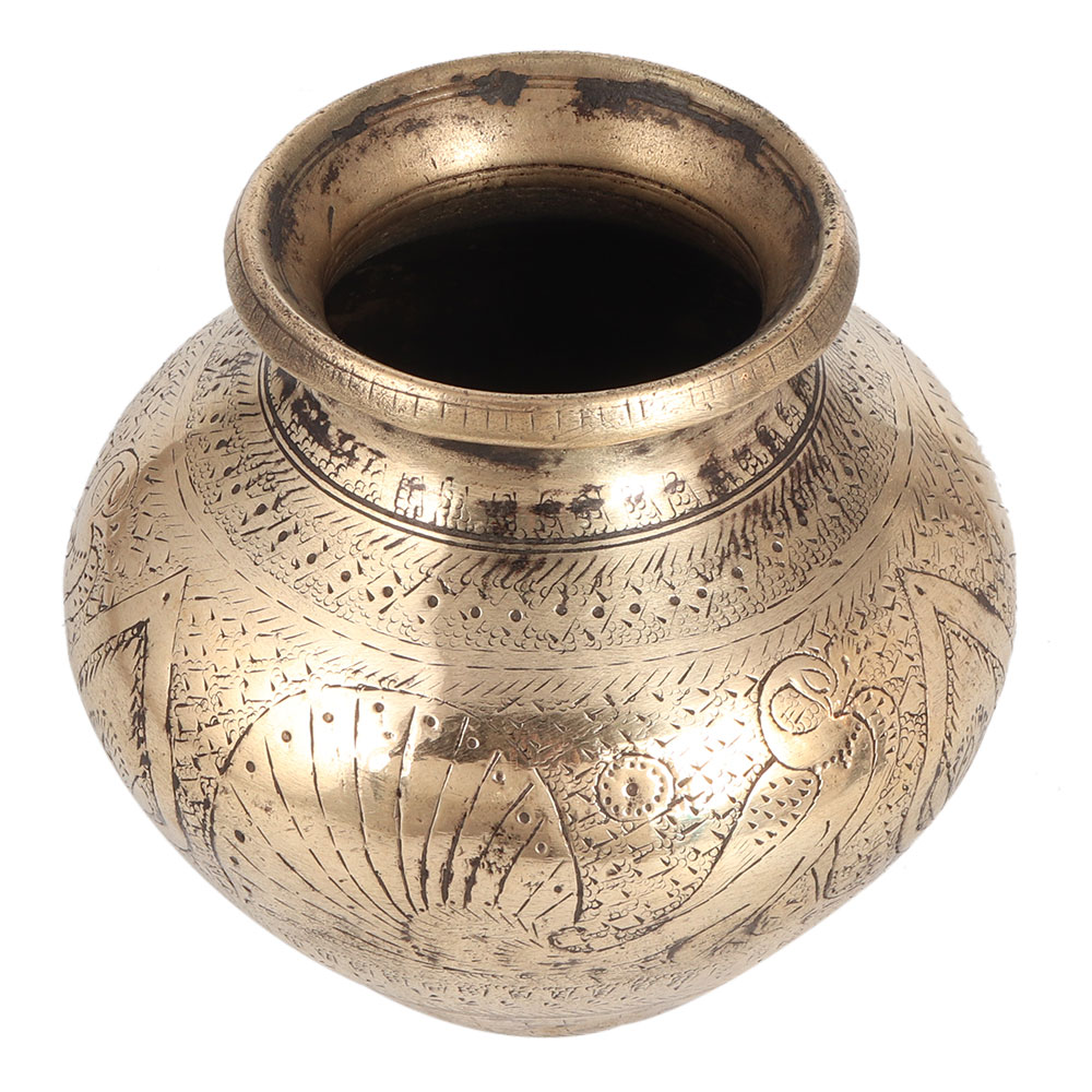 A perfect example of artistic work. This vintage Kalash water pot was engraved with intricate details by Indian craftsmen. A peacock is engraved on the sides of the Kalash and an attractive pattern is engraved on the entire Kalash. It has a flat surface. You can use this pot for stage decoration. Use it as a flower pot for your home. This Kalash is often used for decoration on various occasions. An ideal gift for Deepavali, Christmas or spiritual events.