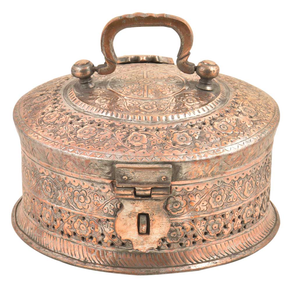 Hand Embossed Copper Betel Nut Pandan Box – with hand hammered floral and incised decoration used to store betel leaf, lime, tobacco and the nut from the areca palm. The practice of chewing betel nut was popular all over Asia and is still a common practice in Myanmar and India. This Pandan betel nut box contains six small pots, each incised on the tops and sides with the same design and metal.