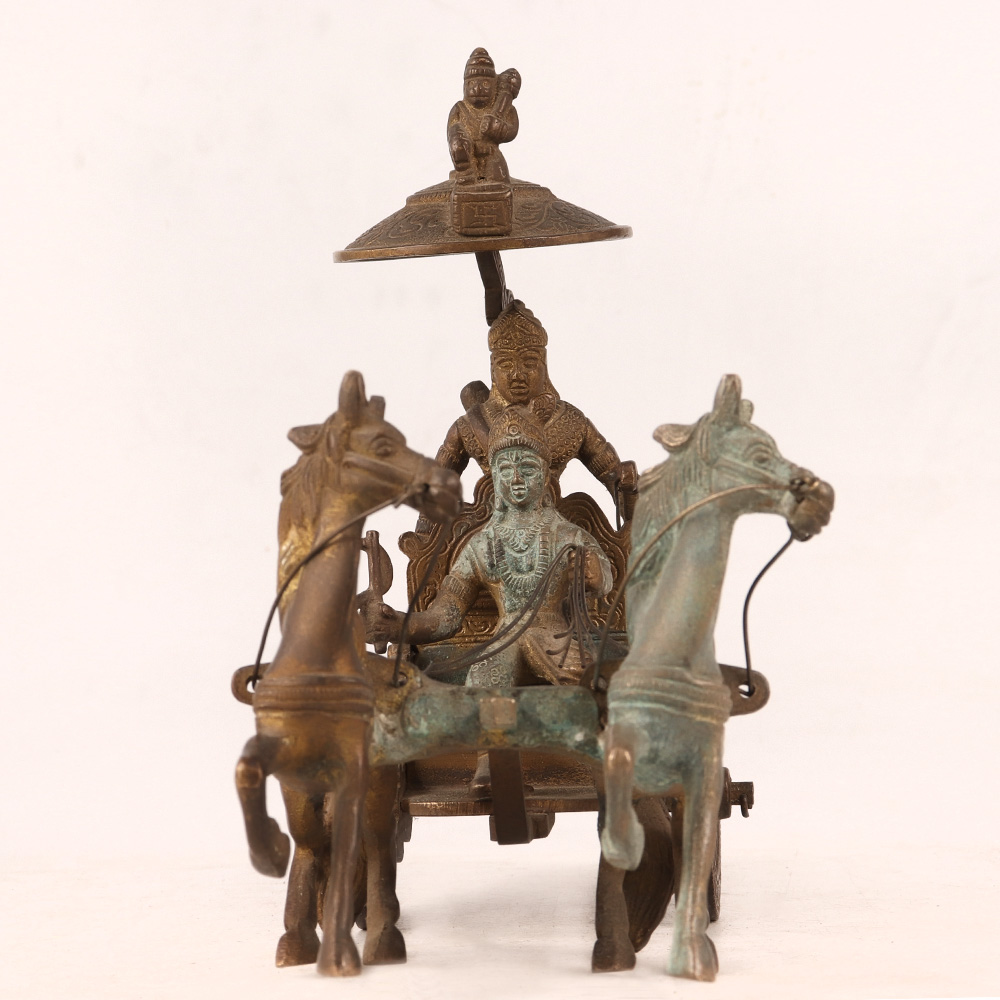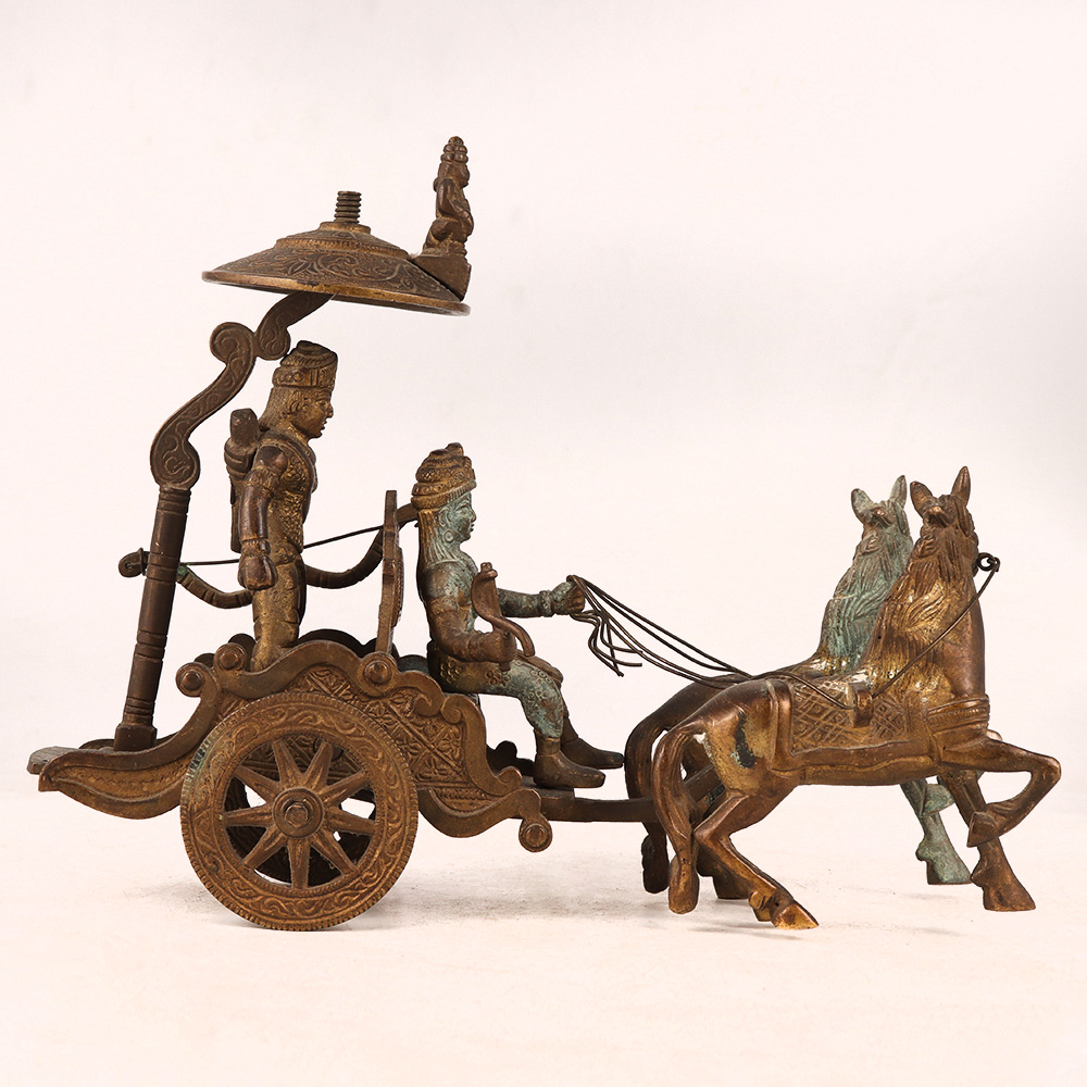 Step back in time with this exquisite vintage brass statue of a brass horse chariot, a stunning portrayal of the iconic scene from the ancient Indian epic, the Mahabharata. Crafted with unparalleled craftsmanship and attention to detail, this brass chariot features two majestic horses, with Lord Krishna gracefully positioned as the charioteer, guiding the chariot through the battlefield. Standing resolutely behind Lord Krishna is the valiant warrior Arjun, and an umbrella above them as a symbol of protection and honour. The statue boasts an antique brown finish, adding an air of authenticity and nostalgia to any space. Meticulously handmade by talented Indian craftsmen, it showcases the timeless beauty of traditional artistry. Crafted from high-quality brass, this statue exudes durability and elegance, making it a prized addition to any vintage collection. This captivating brass horse chariot statue is incredibly versatile, perfect for adorning your home, office, restaurant, hotel, cafe, or shop as a striking decorative piece. It's equally at home in exhibitions or museums, where it can captivate visitors with its historical significance and artistic brilliance. Moreover, it serves as a thoughtful and cherished gift for your loved ones on special or festive occasions, symbolizing blessings, protection, and a connection to India's rich cultural heritage. Embrace the allure of the past with this captivating vintage brass statue and let it transport you to an era of legends and heroism.