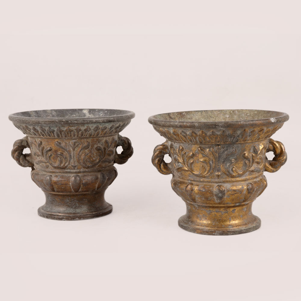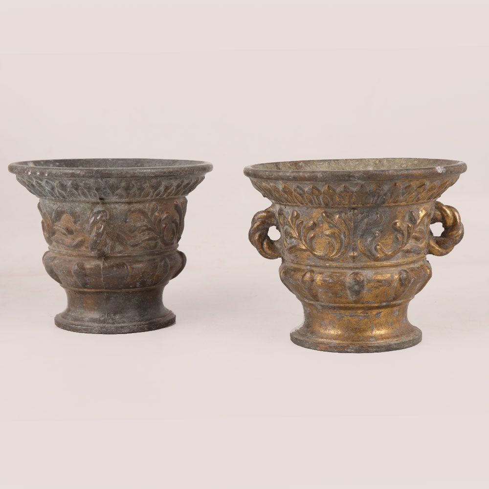 A Vintage Metal Flower Pots in a set of two which are the epitome of elegance and charm. Handcrafted with precision by highly skilled artisans in the heart of Greece, these exquisite flower pots boast a truly authentic English Art-inspired design that will transport you to a bygone era of grace and sophistication. Each flower pot is meticulously finished in a vintage patina, lending an aura of nostalgia and character to any space they grace. These versatile pieces are perfect for adorning your home, office, restaurant, hotel, cafe, or shop, adding a touch of opulence and beauty to every corner. For collectors with a penchant for vintage treasures, these flower pots are a must-have addition to your curated collection. Their uniqueness and artisanal quality make them a valuable find for any collector of vintage decor. Moreover, these flower pots make for exceptional gifts, ideal for your family, friends or relatives on special, festive, or auspicious occasions. Their enduring appeal and timeless beauty will leave a lasting impression, symbolizing your appreciation and thoughtfulness. Embrace the allure of the past with our Vintage Metal Flower Pots, and let them become a cherished part of your decor, your collection, and your heartfelt gift-giving.