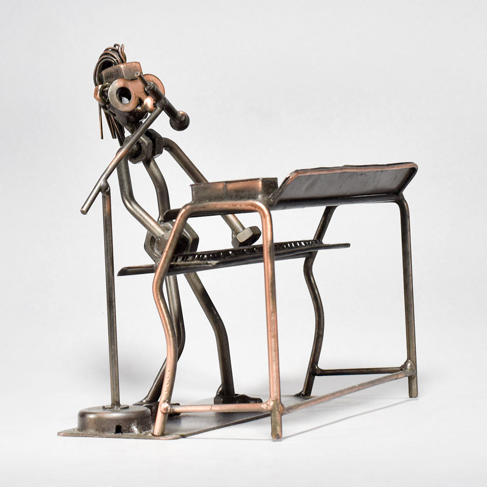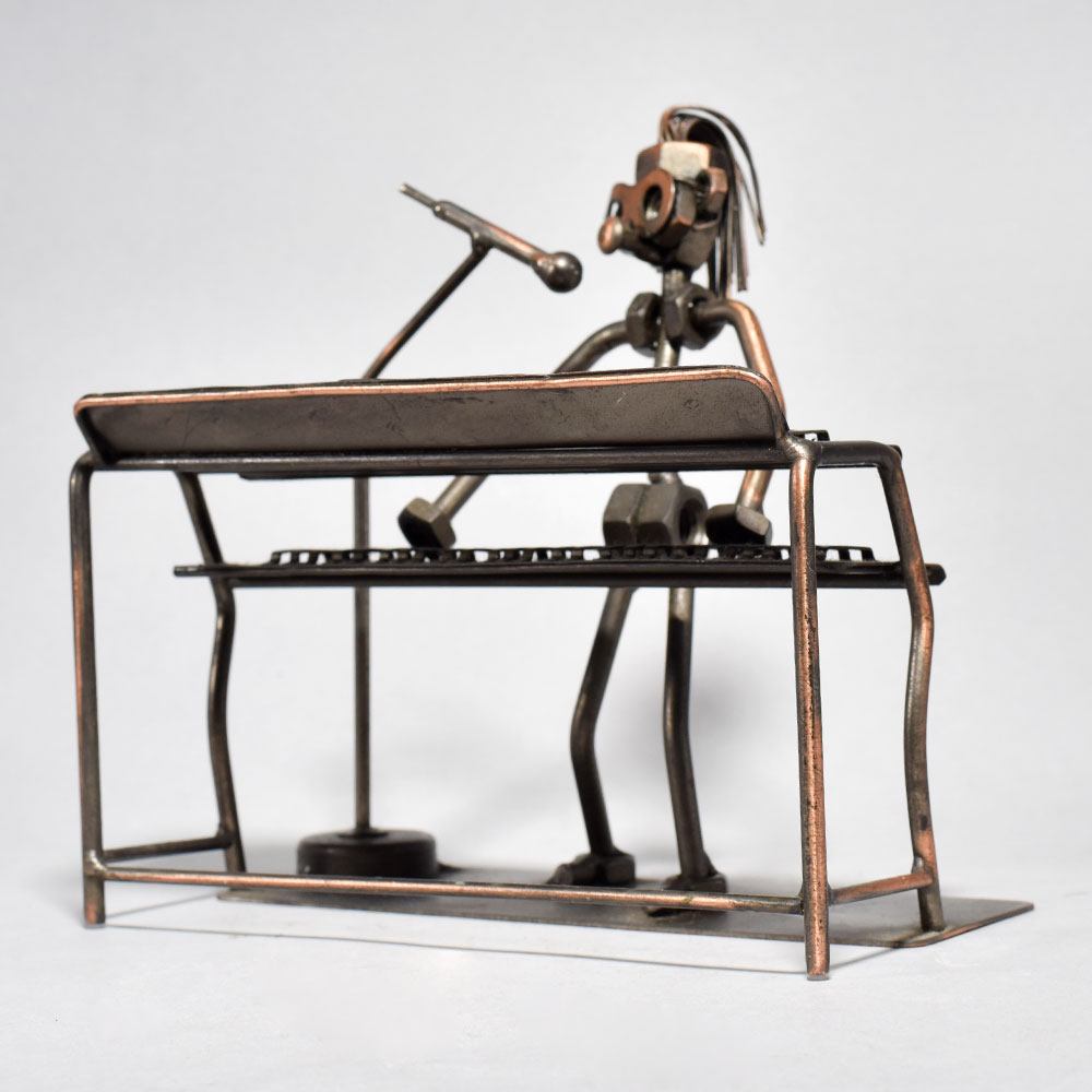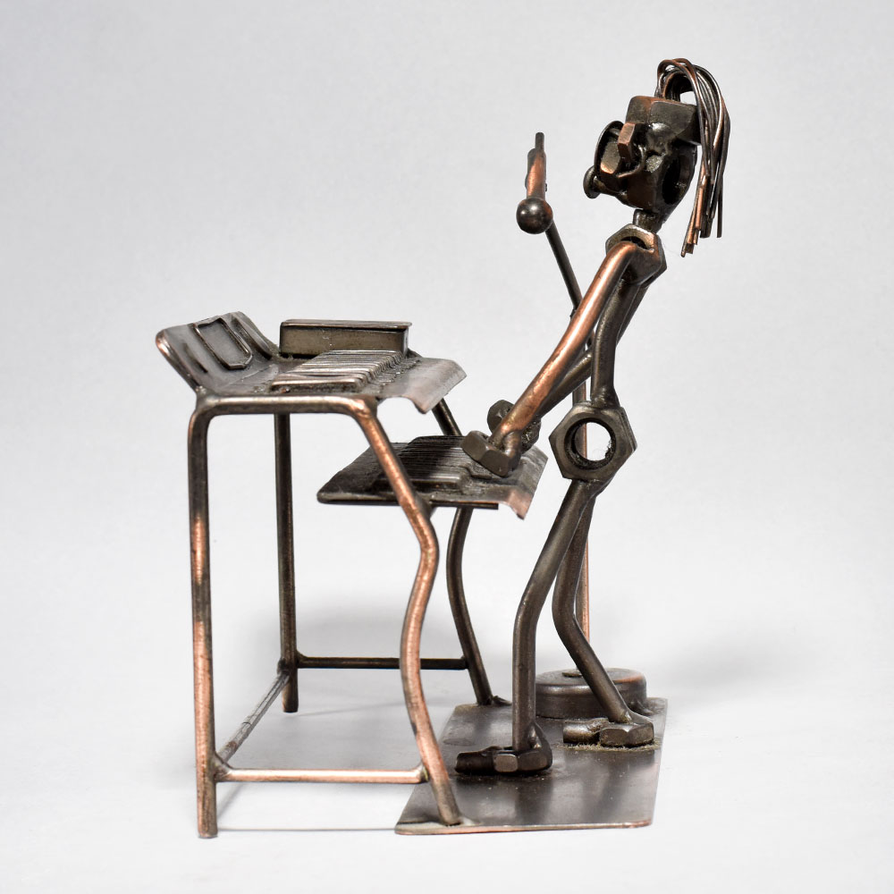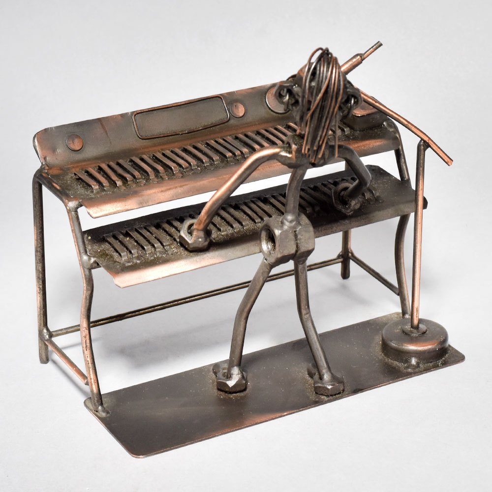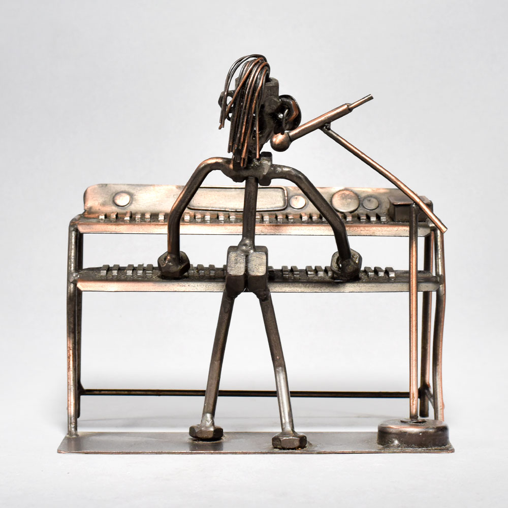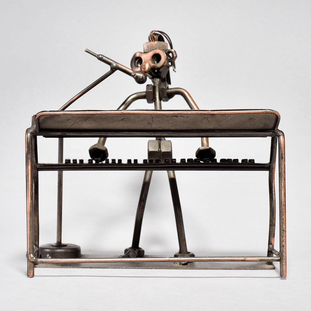 Elevate your space with the captivating artistry of this vintage modern metal sculpture.Bring the spirit of a bygone era into your home or office with this stunning metal sculpture. The figure, depicted mid-performance at the piano, exudes a palpable energy and creative verve that will captivate all who behold it. Display this unique piece to infuse any space with a sense of timeless elegance and artistic flair. Intricately crafted to capture a musician playing piano Vintage-inspired design with a modern, minimalist aesthetic Durable iron construction built to last Showcases the passion and intensity of musical performance This unique handcrafted piece is a testament to traditional artistry, blending functionality with beauty and making it a treasured collectible for years to come. This unique handcrafted piece is a testament to traditional artistry, blending functionality with beauty and making it a treasured collectible for years to come.