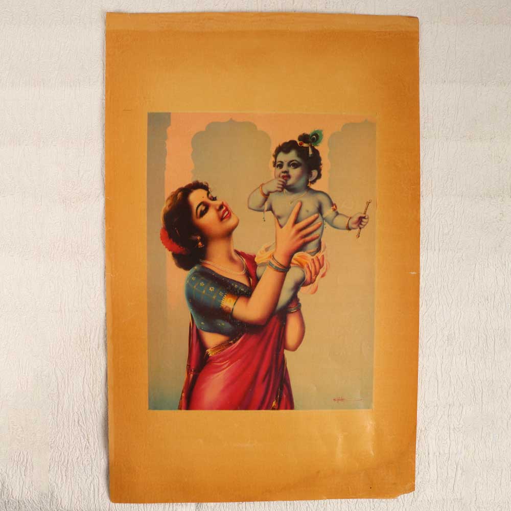 Revel in the beauty of this antique oleograph paper print of Yashoda Maa holding Baby Lord Krishna. This exquisite hand-painted artwork will infuse your home with a sense of tranquility and sacredness. This rare vintage print captures the deep spiritual wisdom and unconditional love between foster mother Yashoda and baby Krishna. The colors are rich with symbolism, inviting you to contemplate the presence of the divine in each moment. Surround yourself with peace and connect to ancient tradition with this oleograph paper print. Display it in your meditation room, puja altar, living room, or office as an uplifting reminder to nurture your inner light. It also makes a thoughtful, meaningful gift for Hindu friends and family.
