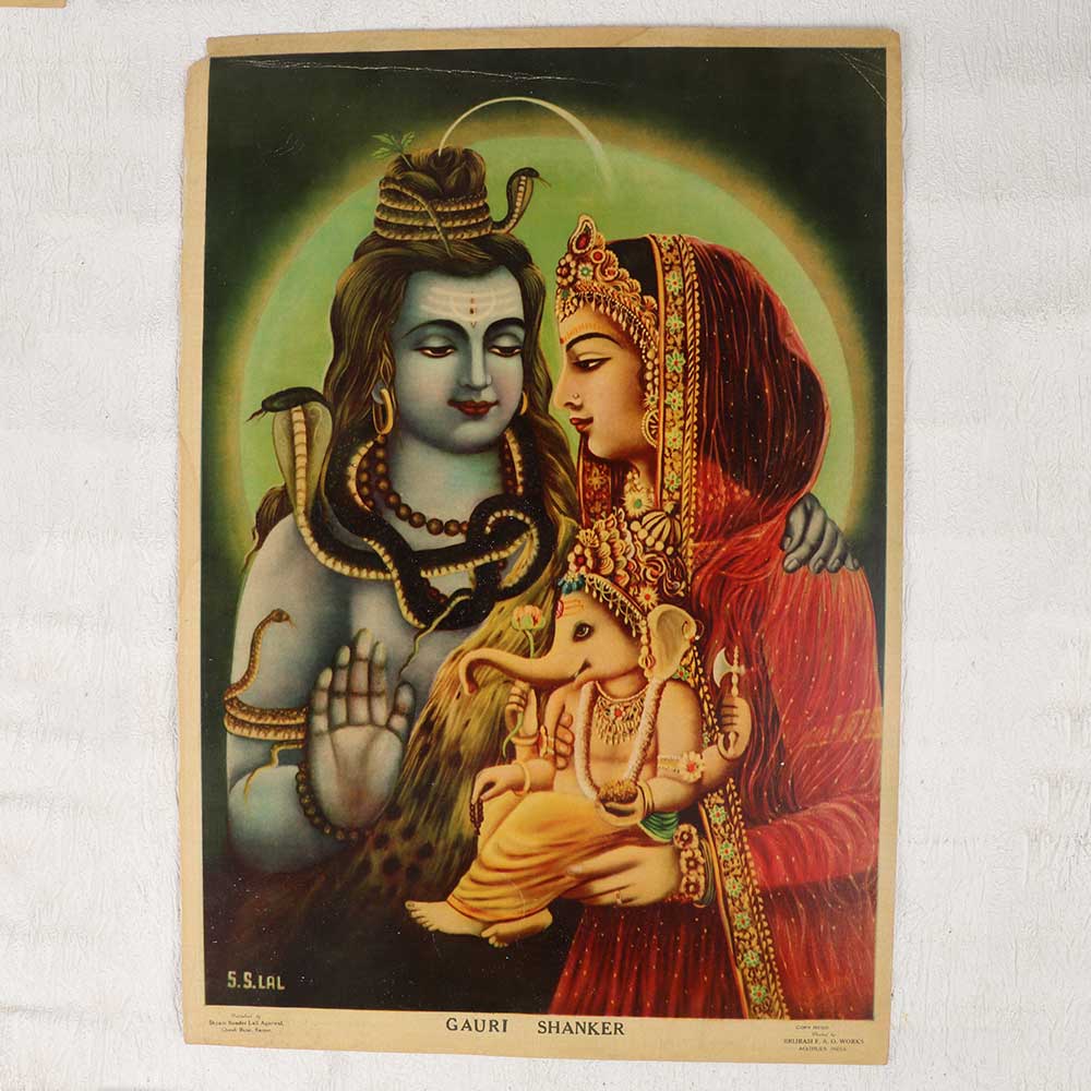Feel the serenity of the divine Hindu family in this breathtaking vintage oleograph of Lord Shiva, Goddess Parvati, and baby Ganesha by renowned Bengali artist S.S. Lal. As an authentic icon of Bengal's rich artistic lineage, this paper print will uplift your home with its spiritual aura and expert artistry. For devotees who wish to honor Hindu deities through art, this is a must-have piece. Place it in your meditation room or puja space to focus your daily spiritual practice. Or showcase it in your living room as an inspiring conversation starter. However, you display it, this vintage oleograph print pays tribute to the rich cultural heritage of Bengal.