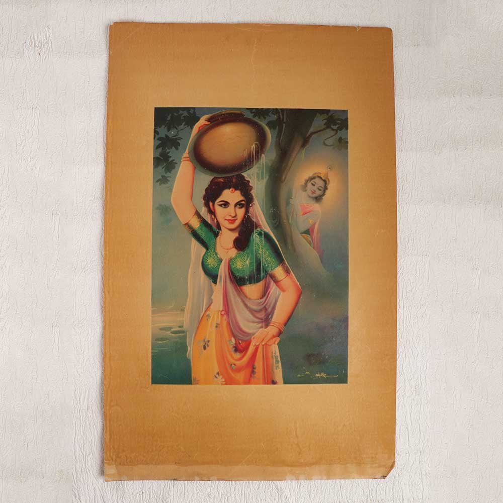 Step back in time with this rare vintage oleograph print depicting Lord Krishna and Gopi, emanating history, devotion, and beauty. Lovingly restored from an antique print, this exquisite image highlights the intimate relationship between god and devotees in Hindu culture. Profoundly significant for Hindus, this antique oleograph print allows you to celebrate Lord Krishna in your home while adding vintage charm to your decor. Place it prominently on your puja altar to focus your daily worship, or display it in your living room, office, or bedroom for an inspiring spiritual focal point. For Hindus, history buffs, and vintage decor lovers, this exquisite oleograph print infuses your home with sacred symbolism, old-world charm, and divine presence.