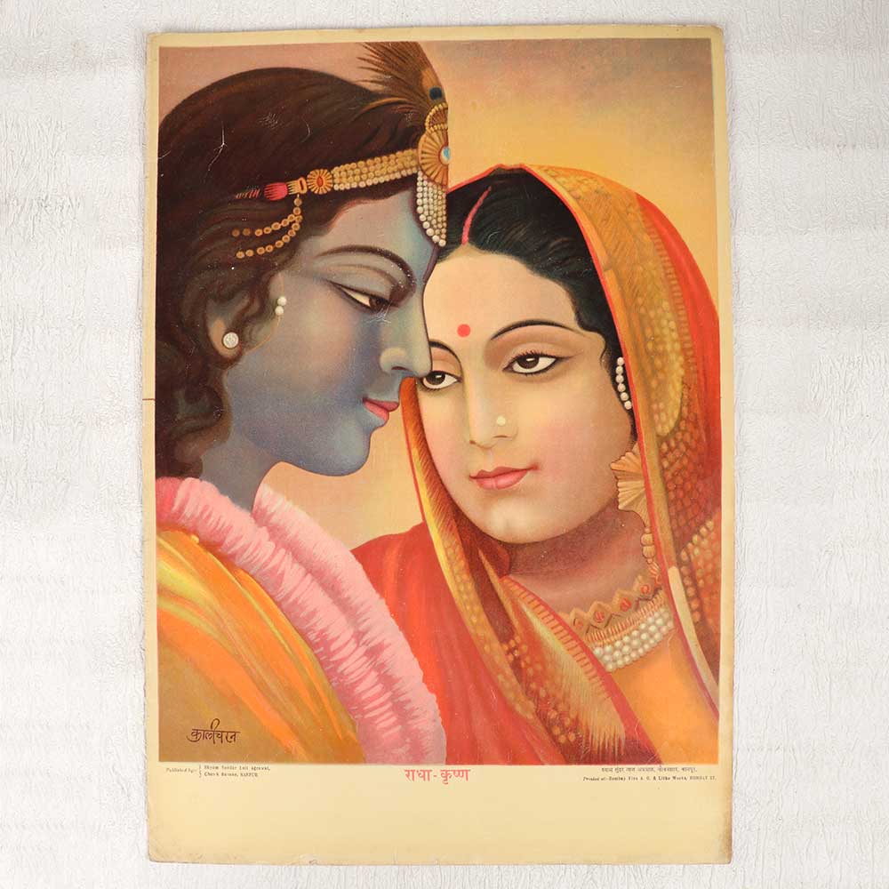 Be transported to the grace and beauty of 1920s India with this rare vintage oleograph print of Radha Krishna. Meticulously printed on textured paper using the oleograph technique, this exquisite artwork depicts Radha and Krishna locked in a romantic embrace. Radha rests her head on Krishna's shoulder as he plays the mesmerizing tune of his flute, their eyes meeting in an affectionate gaze. The blend of rich indigo, vermillion, gold, and green hues creates a vibrant palette. Delicate decorative details like floral patterns, leaves, and miniature figures surround the central subjects. The oleograph technique involves applying oil-based inks on a metal plate, resulting in deeply saturated colors and fine impressions. This rare vintage artwork is a must-have for devotees of Krishna and art collectors interested in antique Indian prints. Place it in your puja room, living room, bedroom, or office to add a piece of history to your decor. The vintage oleograph print of Radha Krishna evokes the beauty and craftsmanship of a bygone era.